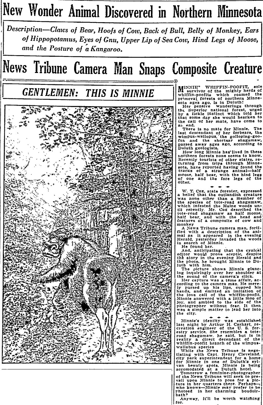 • Variants: in Late July, of 1921 Northern Minnesota's News Tribune had two days of coverage of "Minnie the Whiffin-Poofit" an apparent cousin of the shagamaw, which had "The claws of a bear, Hoofs of a Cow, Back of a Bull, Belly of a Monkey, Ears of a Hippo, eyes of a Gnu, the upper lip of a SeaCow, the hind legs of a Moose and the posture of a Kangaroo." - she was apparently the last of her kind and any potential mates such as "the wimpus-wallopus", "the golloping-goofus" and "the shortear shagamaw" hd gone extinct ages ago.... (the article gives a nod to W.T.Cox as well, stating that when asked, he believed it to be a member of the Shagamaw family) -