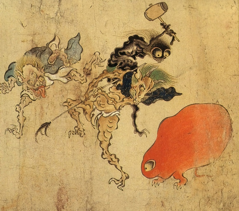 • Similar yokai: Something which we do know for sure is that the poses of Zenfusho and Company are likely borrowed from a Muromachi-era Hyakki Yagyo Emaki picture scroll. [below] The yokai that Zenfusho and Koinryo are imitating aren’t named, but the one Yarikecho is copying is ‘Kanazuchibo’, posed with his mallet to smack down ‘Okka’ as usual. I’ve also read some yokai scholars compare the horned yokai with Koinryo pose’s face to the Kirin but I don’t buy it…as usual, these scrolls are so old, it’s impossible to say what might have been on the original artist’s minds.