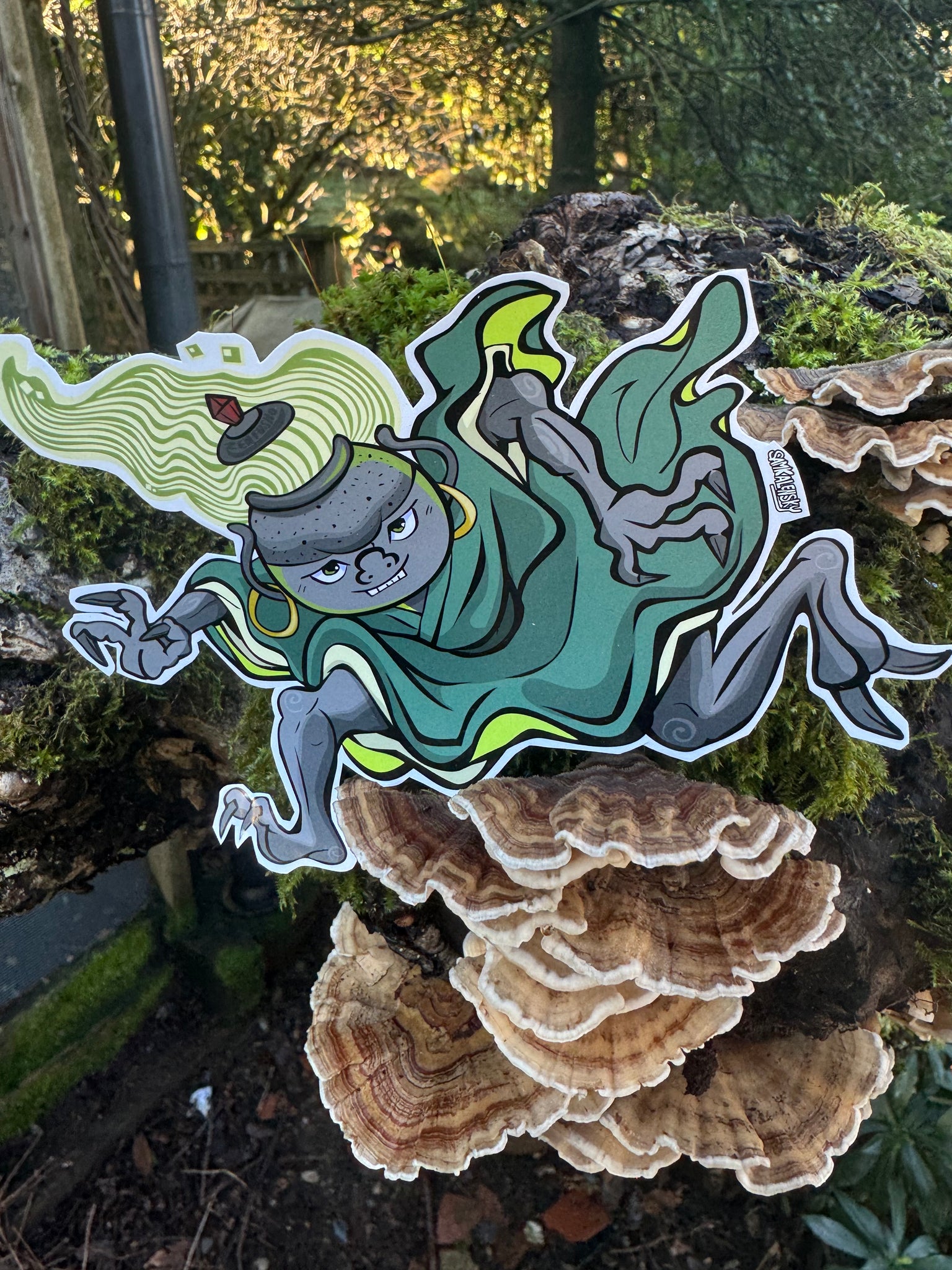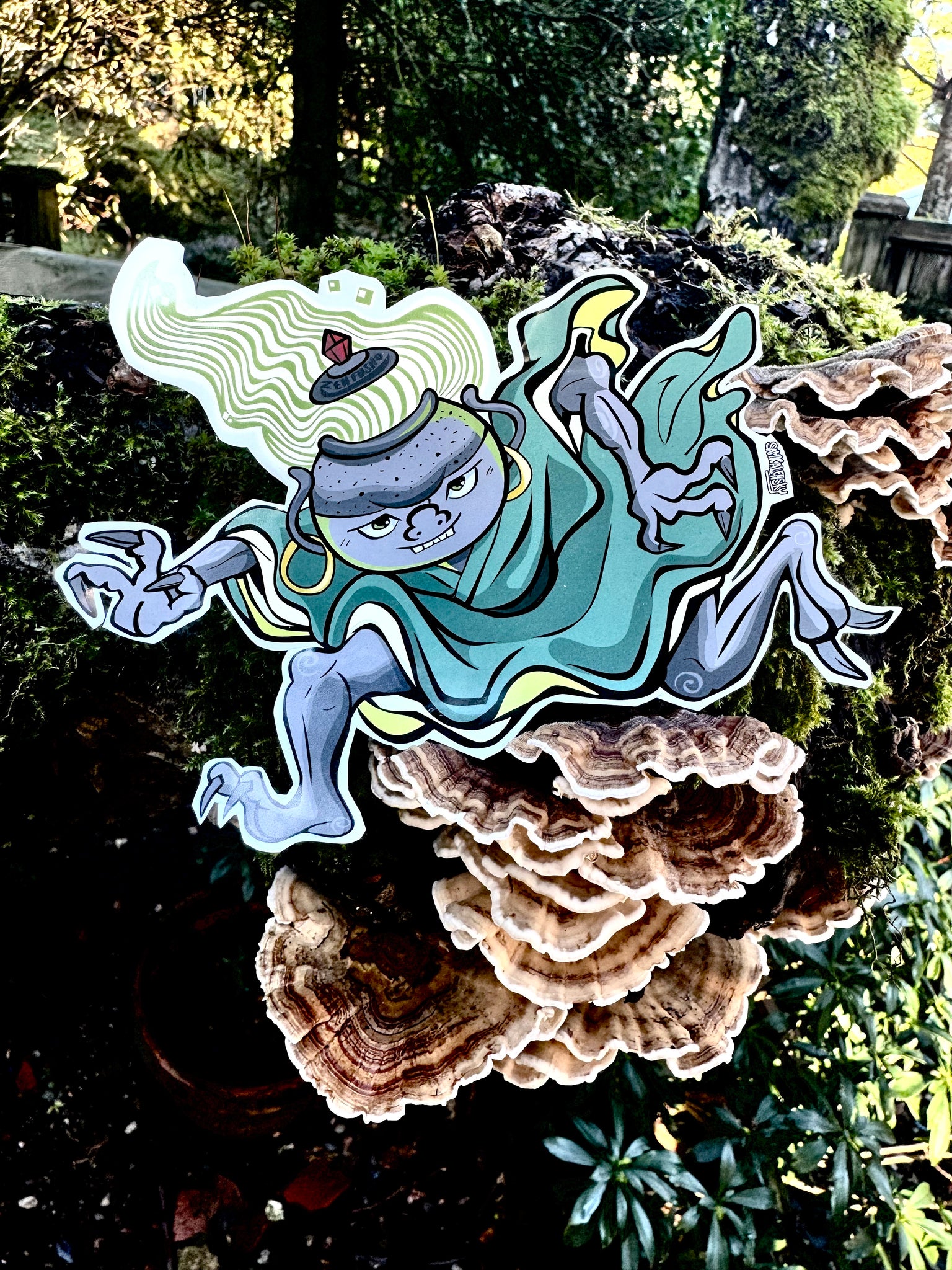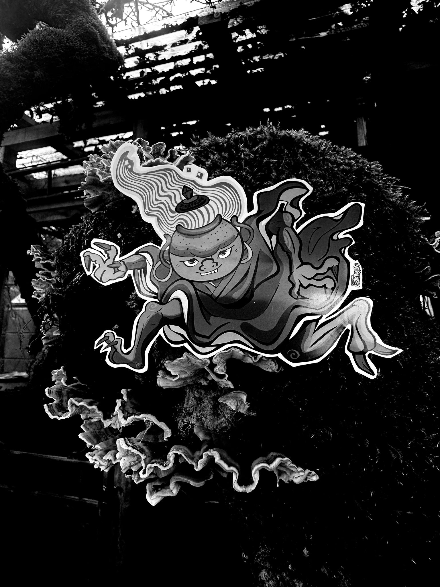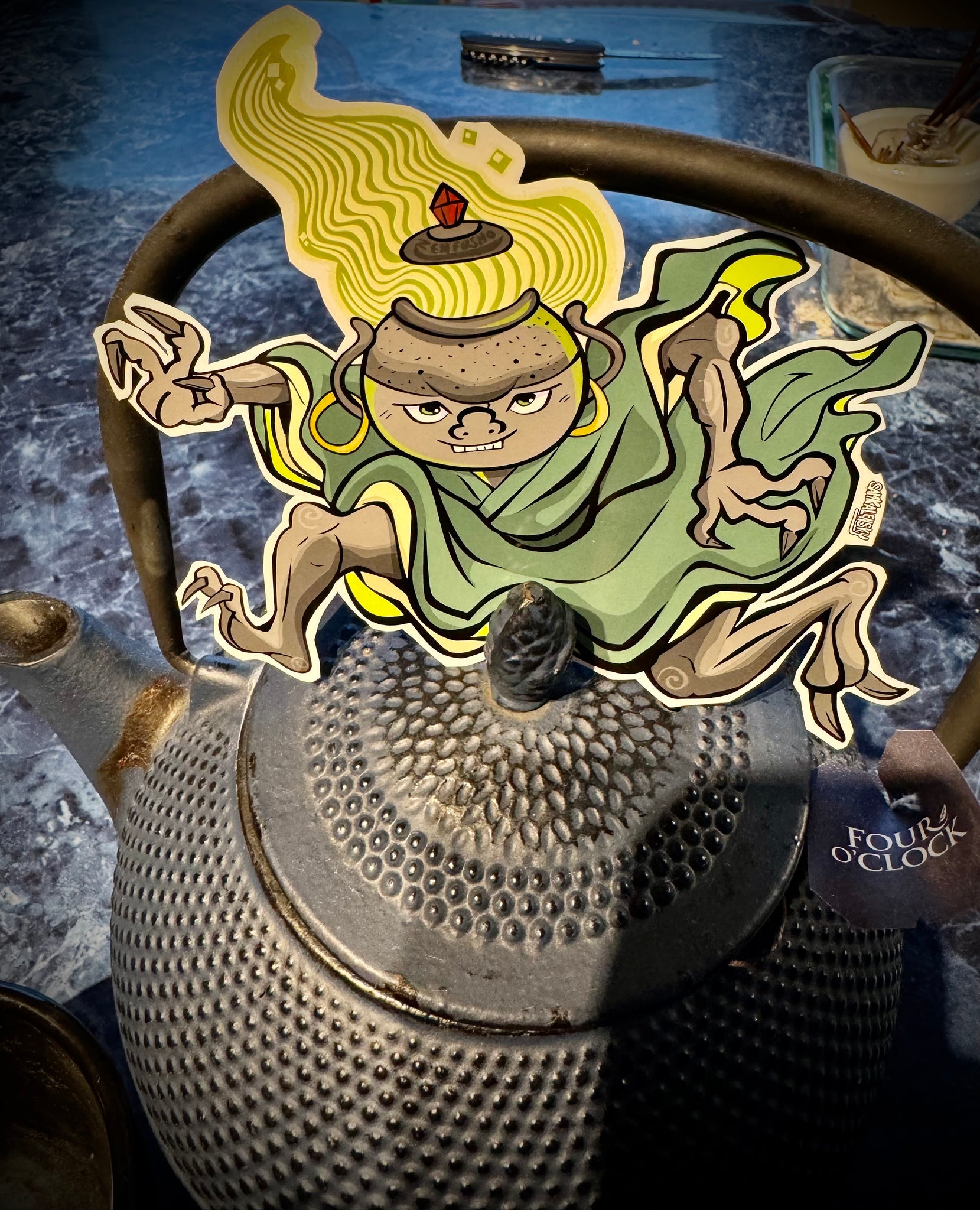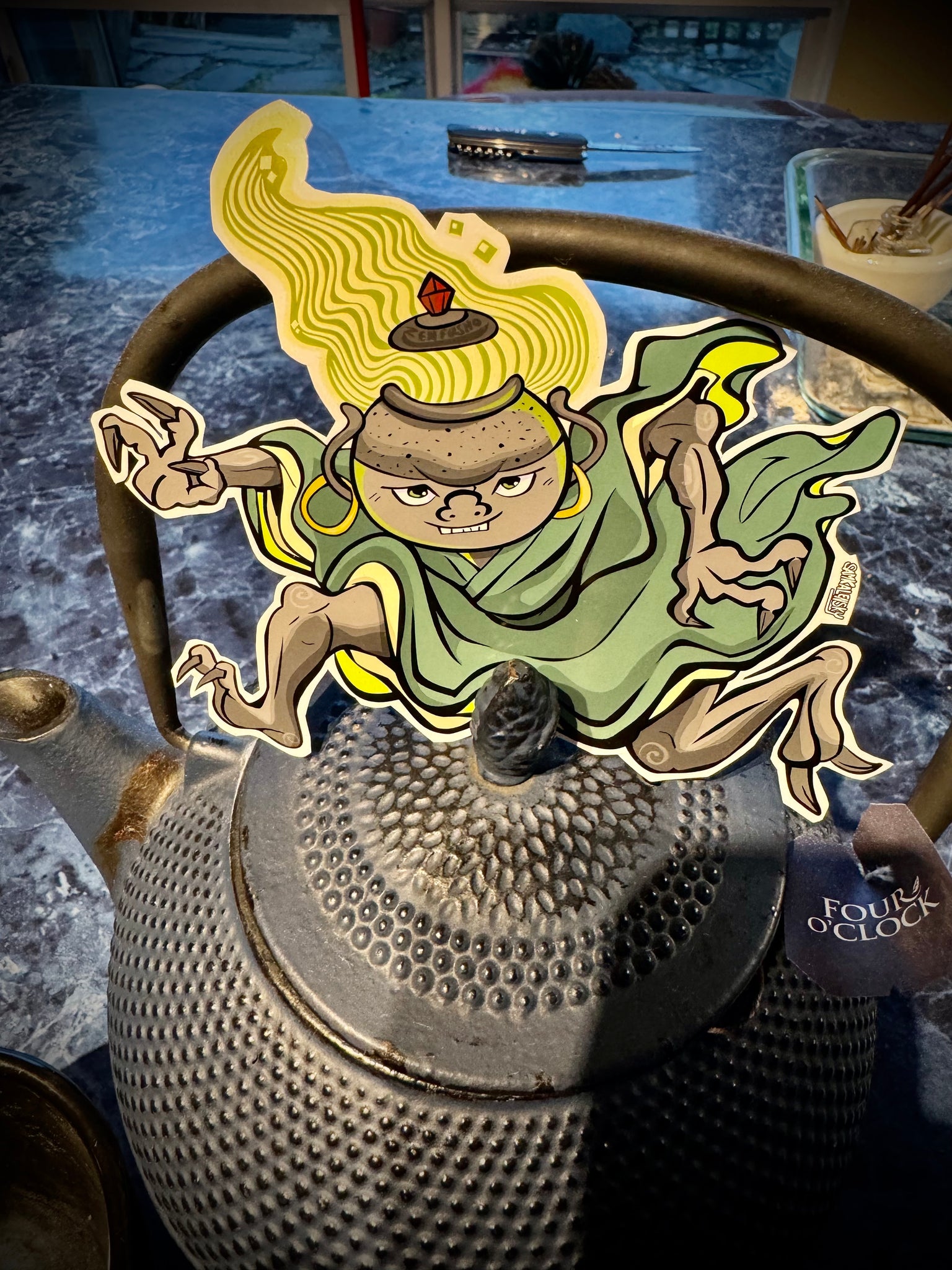 • About this Yokai: A tsukumogami with the head of an antiquated kettle. It overflows with an endless supply of hot water (or possibly tea or steam) resembling a mop of hair. It has a goofy upturned, pig-like nose and buck teeth. It thrives in gloomy atmospheres, leaping about causing a ruckus, splashing tea everywhere! The tea pot springs to life and dances wildly at an otherwise peaceful tea ceremonies, ruining the tranquil scene! following the example set by a certain Tanuki… *The Final member of "Yarikecho’s mushroom extermination crew" in charge of cleanup.