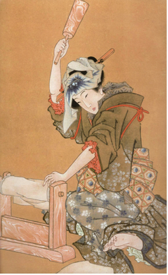 [Below: Right a woman beats cloth using a Kinuta (laundry mallet)]
