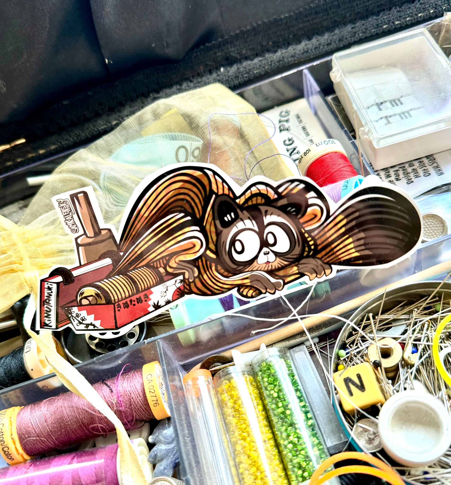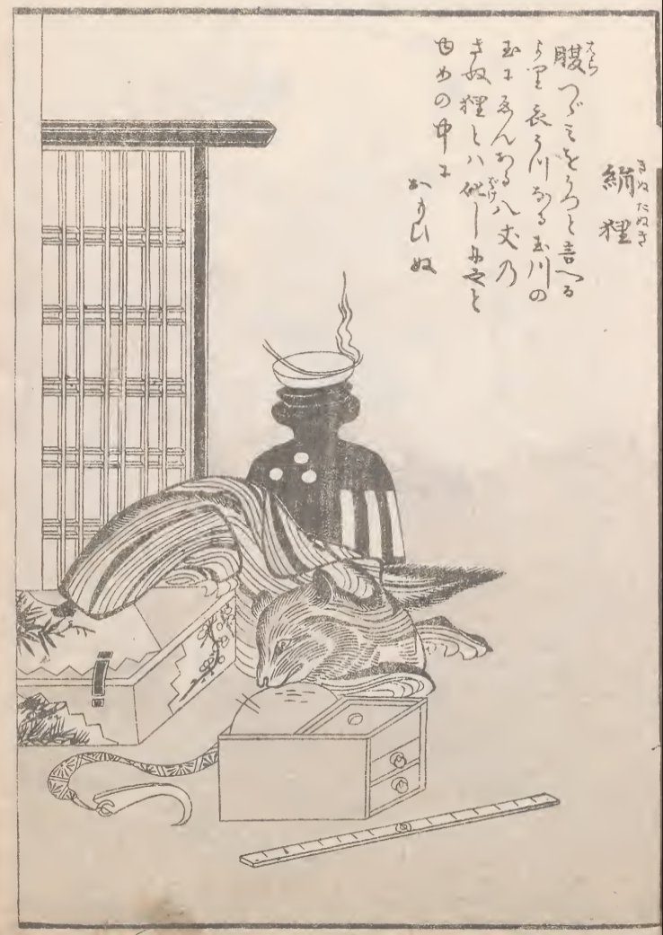 • Origin: Kinutanuki appears first named in Toriyama Sekien’s "Gazu Hyakki Tsurezure Bokuro" (1784). The illustrated scene depicts the inside of a tailor's shop including measuring tools, a kimono rack and sewing kits strewn about. A lit incense burner burns nearby. The yokai appears as a silken striped cloth with a tanuki's face, feet, and tail. It sits flopped and folded over onto itself, and appears to be coming out of a decorated fabric box. Toriyama’s included verse goes as follows: