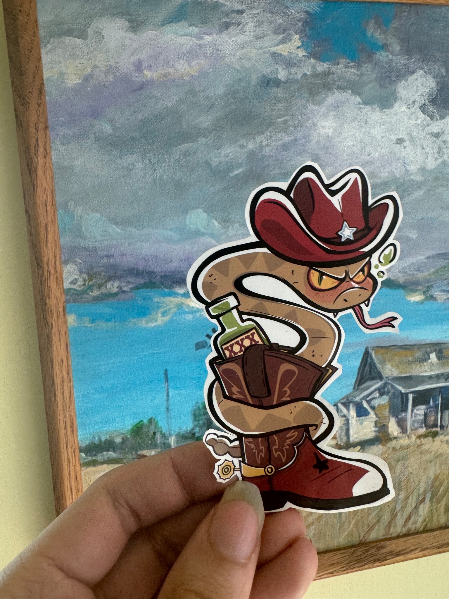 âĒ About this critter: A rattler witch takes up residence at the bottom of a cowboys boot or maybe in a ladies stockin’ — They’re known to come flyin’ out, right when the wearers at their most vulnerable and ain’t expecting it! They tend to go after drunks… — *Hic*