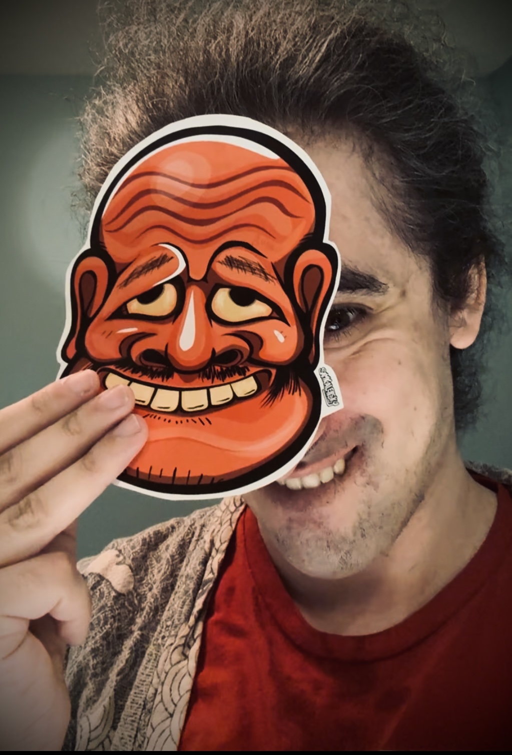 • About this mask: A Noh mask with a comedic expression, as though it were holding back laughter, anger, embarrassment or crying (depends which way you tilt it or the how the light hits it (& the story of the play its in) – it has gold-plated magical eyes & clenched teeth suggesting that it is perhaps holding back great power! (supposedly it’s an exaggerated version of the O-beshimi masks typically used for Tengu related performances in Noh theatre, hense the big nose.) – it comes in a few colours (Commonly Red, Black & Blue.) sometimes its eyes appear as if they’re bulging from its head!