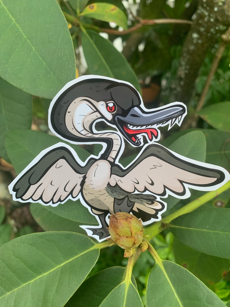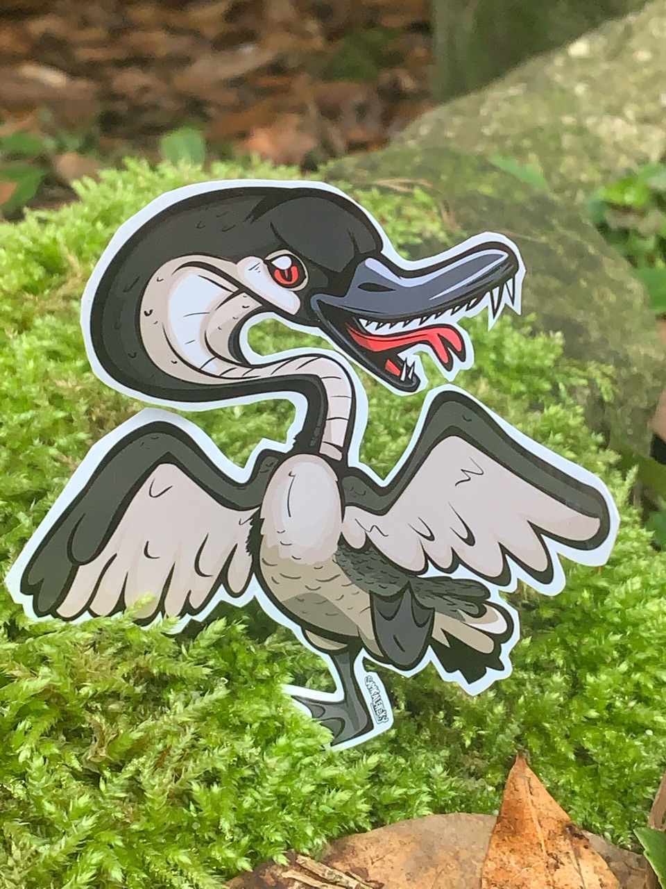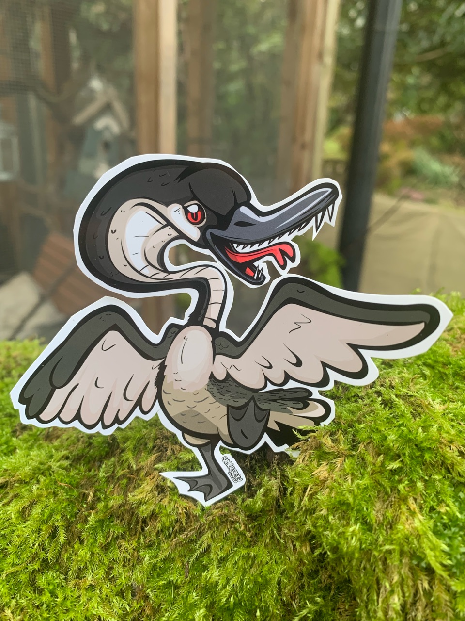 • About this Critter: Beware the vicious Canadian Cobra Chicken! – Named for their long necks and the horribble sound they make, what appears at first to be an ordinary goose, suddenly extends its neck, hisses and reveals itself to be a creature of a much meaner disposition. – They can range in size from that of an average goose to nearly the size of a bus!! – (the truly massive ones are not to be confused with our gigantic glowing goose, Binesi (aka “Big Goose”) – Reguardless of their size, Cobra Chickens are In-fact the epitome of Canadas apex predators and are a menace to Birders, Joggers, Bikers, Loggers, Polar Bears, Cougars & Children alike!! – Their serrated bite is particularly poisonous and should be avoided at all costs. – it has been advised that maple syrup makes for an excellent all-purpose cobra chicken repellant & a natural cure to their bite, as such it is important that Canadians keep some maple bonbons on their person at all times, as you never know when a cobra chicken might be lurking nearby, getting ready for a surprise attack…