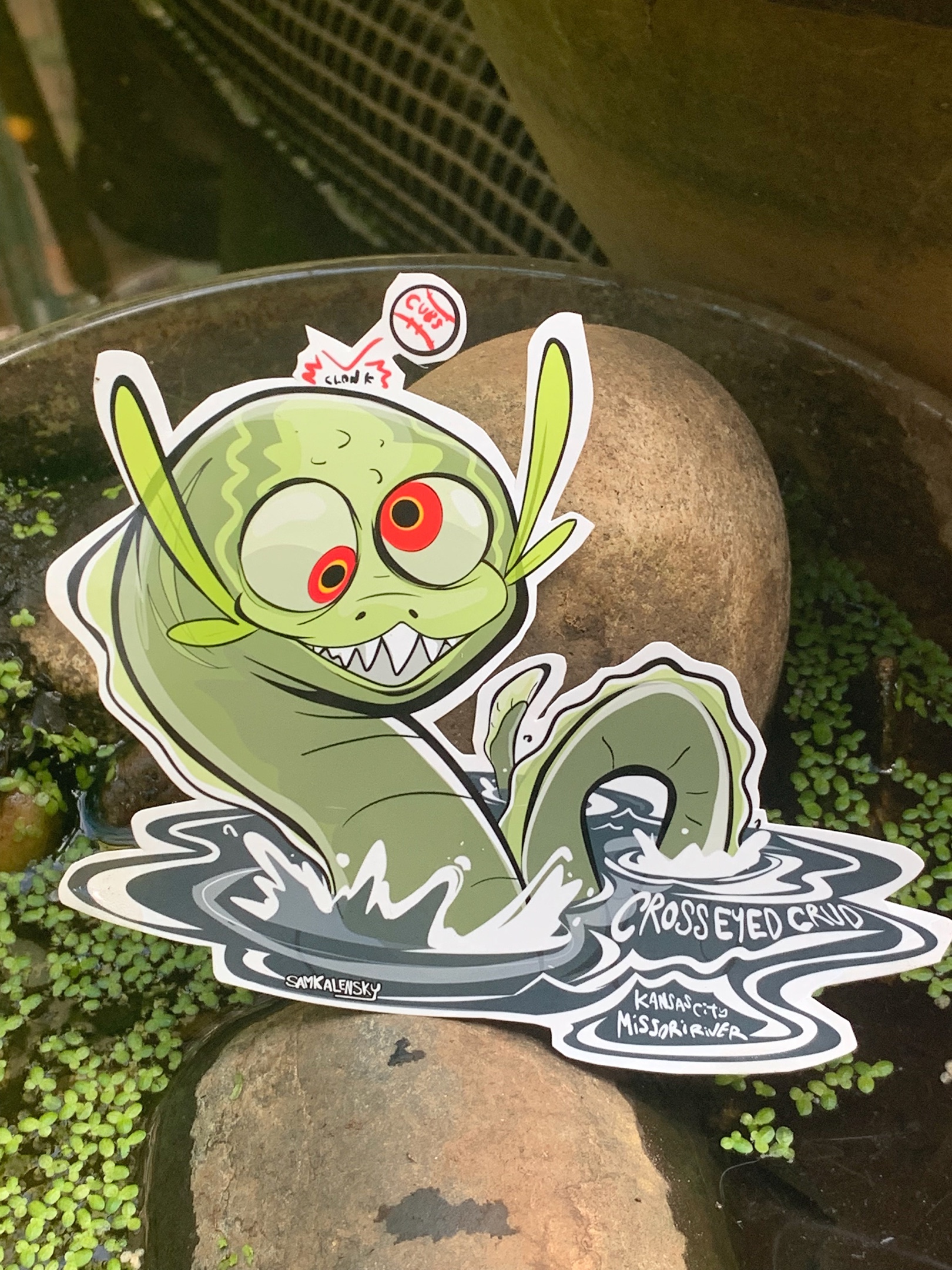 • About this critter: A slippery, seldom seen cross-eyed serpent, something like a cross between a catfish and an Eel. it stalks & surprises sailors, fishermen, and baseball players. – Said to be a ‘miscreation’ of the Missouri river where it dwells underneath the surface crud.- Not much else is confirmed about the critters appearance, other than that it is cross-eyed. – it’s a sly. slippery one, that only rises from the muck, only when and if it wants to be seen. – According to legend, a man named ‘Sammy Vandy’ was able to catch the crud by beating it in a wrestling match underwater.*