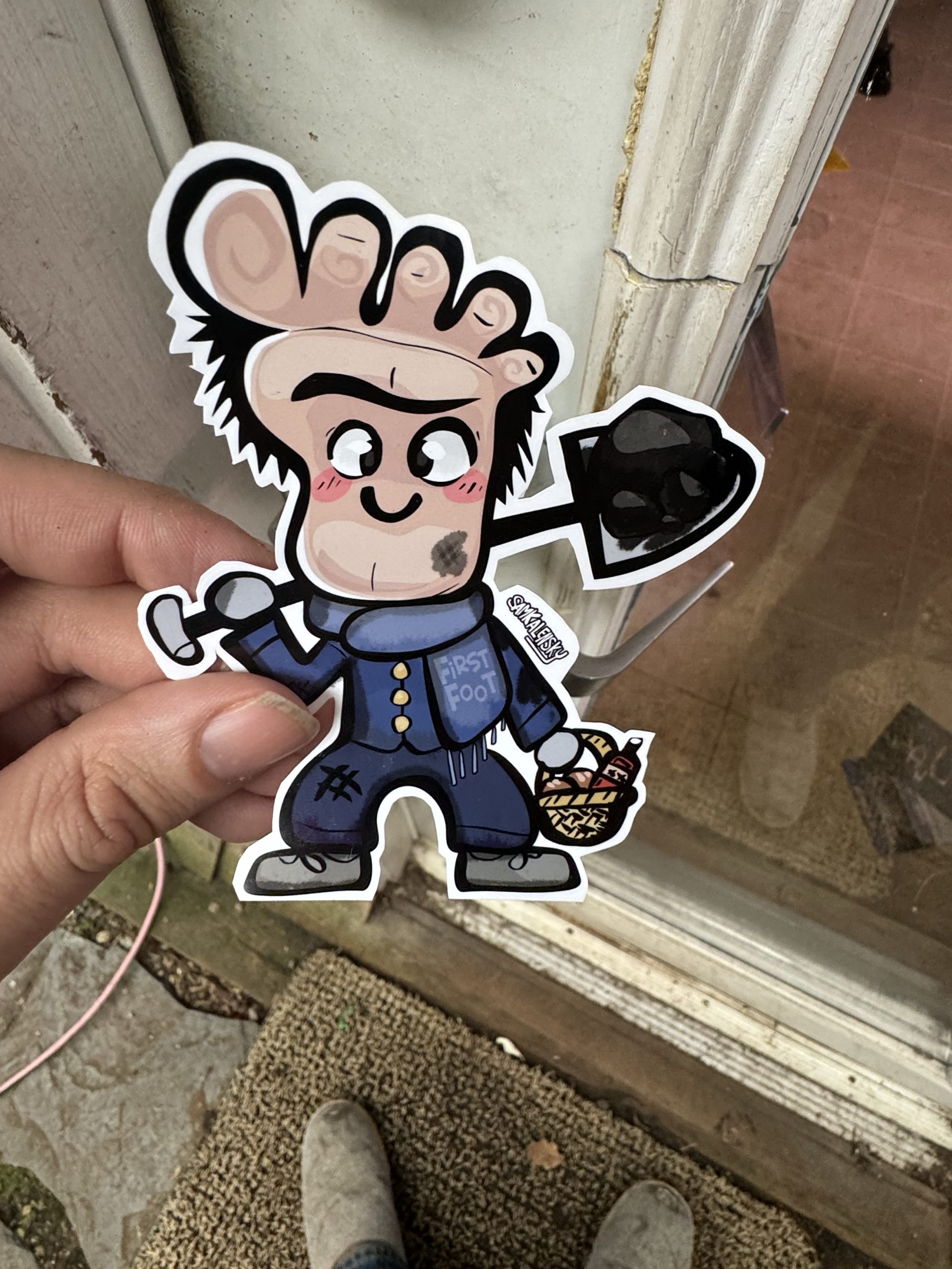 • History: There are many MANY variants to the new years ‘First-Footing’ tradition found across Scotland, the UK, British Islands & France. Some places make a bigger deal of it than others so specifics of the tradition or what it’s called will change with the region. Embellishments & reversals to the above conditions are often commonly added, becoming micro folklore in particular areas too. The specifics of what is considered lucky or unlucky in both the first foot’s appearance & the gifts they bring can be hyper-specified or loose, but generally it’s said that it’s most fortunate to have it be a ‘man of fair skin, with dark hair.’ or something along those lines. The gifts they bring also change frequently. In addition to ‘the shovel full of coal’ he might bring other auspicious gifts such as silver coins, shortbread, buns, salt, coal, and a drink, usually whisky! Some traditions include the first foot singing “Auld Lang Syne” (or another song) as they burst through the door with their gifts!