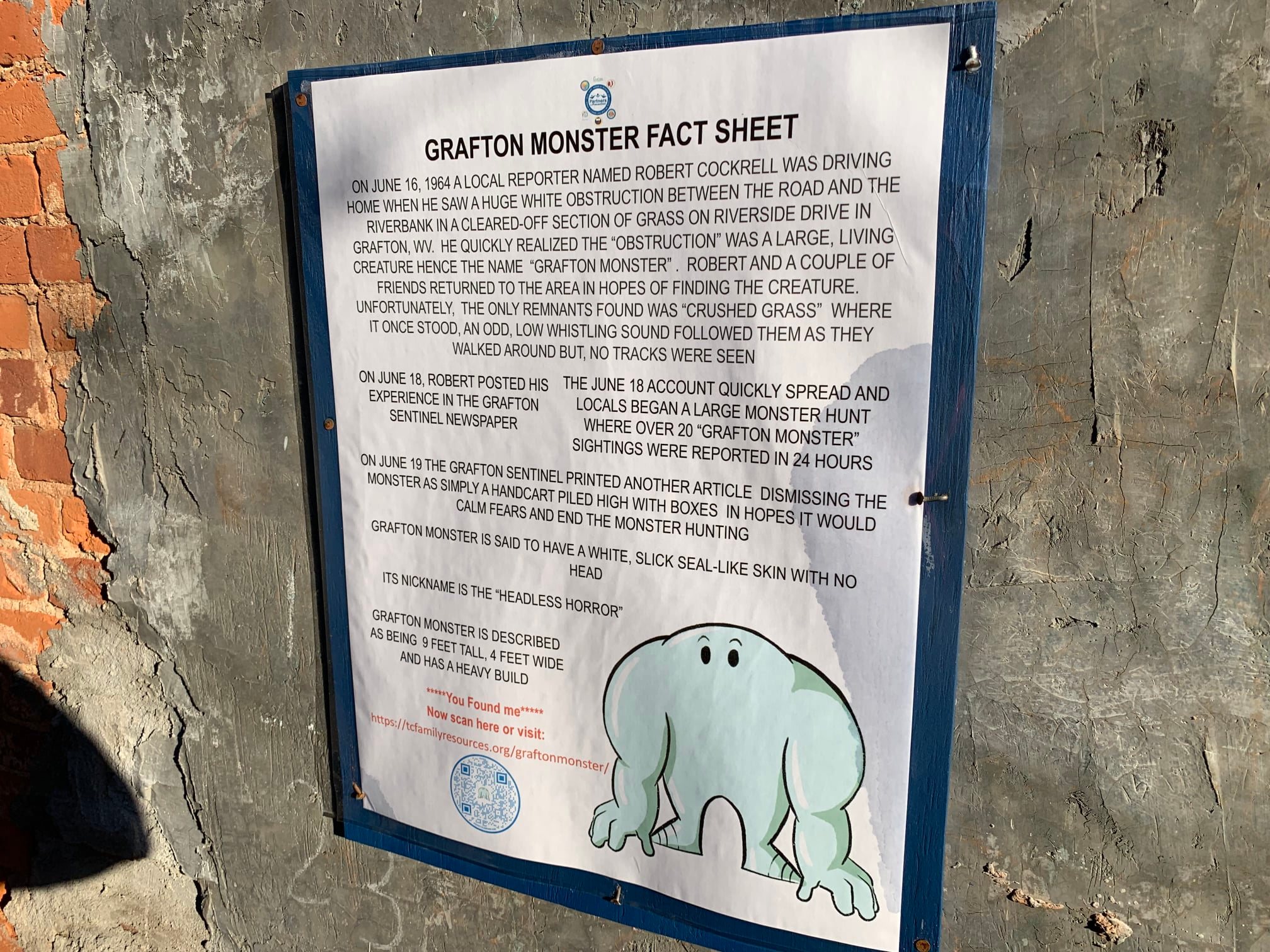 The creature has also been featured as a part of modern day Taylor county kid-friendly monster hunts too! – I am unaware if thereâs a Grafton monster festival yet [pandemic times and what not.] – But it has certainly become the resident monster mascot for the town!