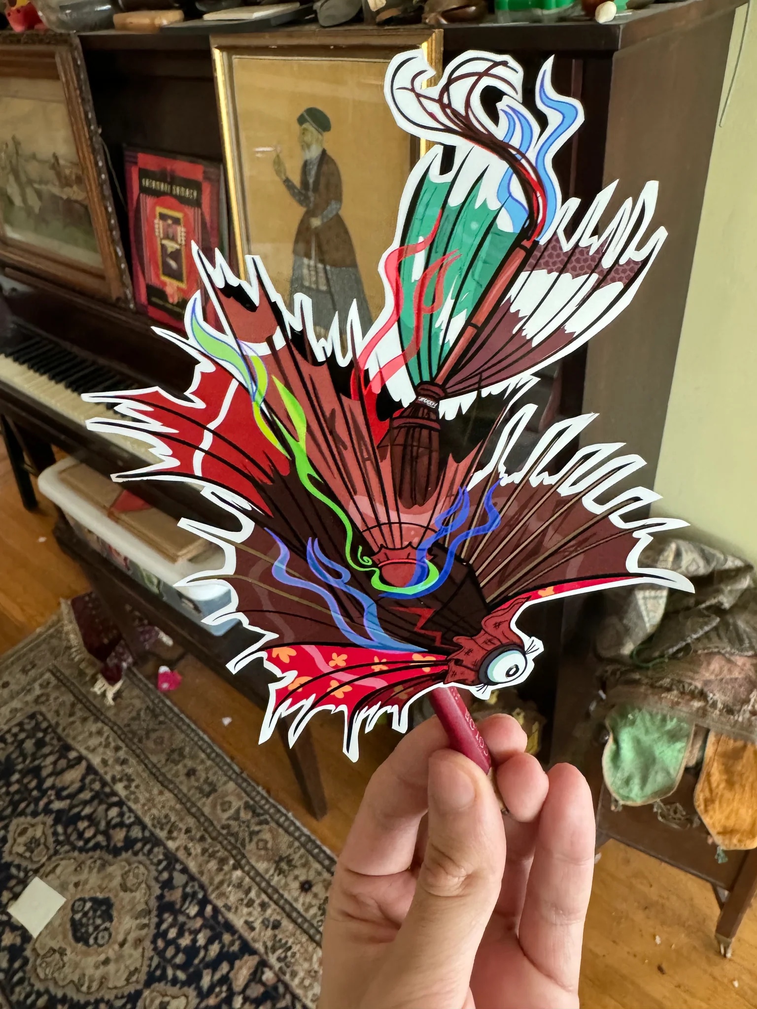 The poem references another Yokai originating from china called the ‘Chiwen’ But In Japanese the yokai is better known as the “Sachihoko” – Those golden tiger-dragon-fish roof ornaments that you can sometimes see on top of Japanese (& Chinese) castles! They’re said to be rain gods who protect buildings from fires by bringing rain. – Which is something this poor bent, burning umbrella clearly needs… its ‘bones’ are exposed, its on fire, and its been bent in a similar sorry shape. – Toriyama compared it to this yokai, so that’s where the idea that it controls storms comes form. in essence its an umbrella-dragon.