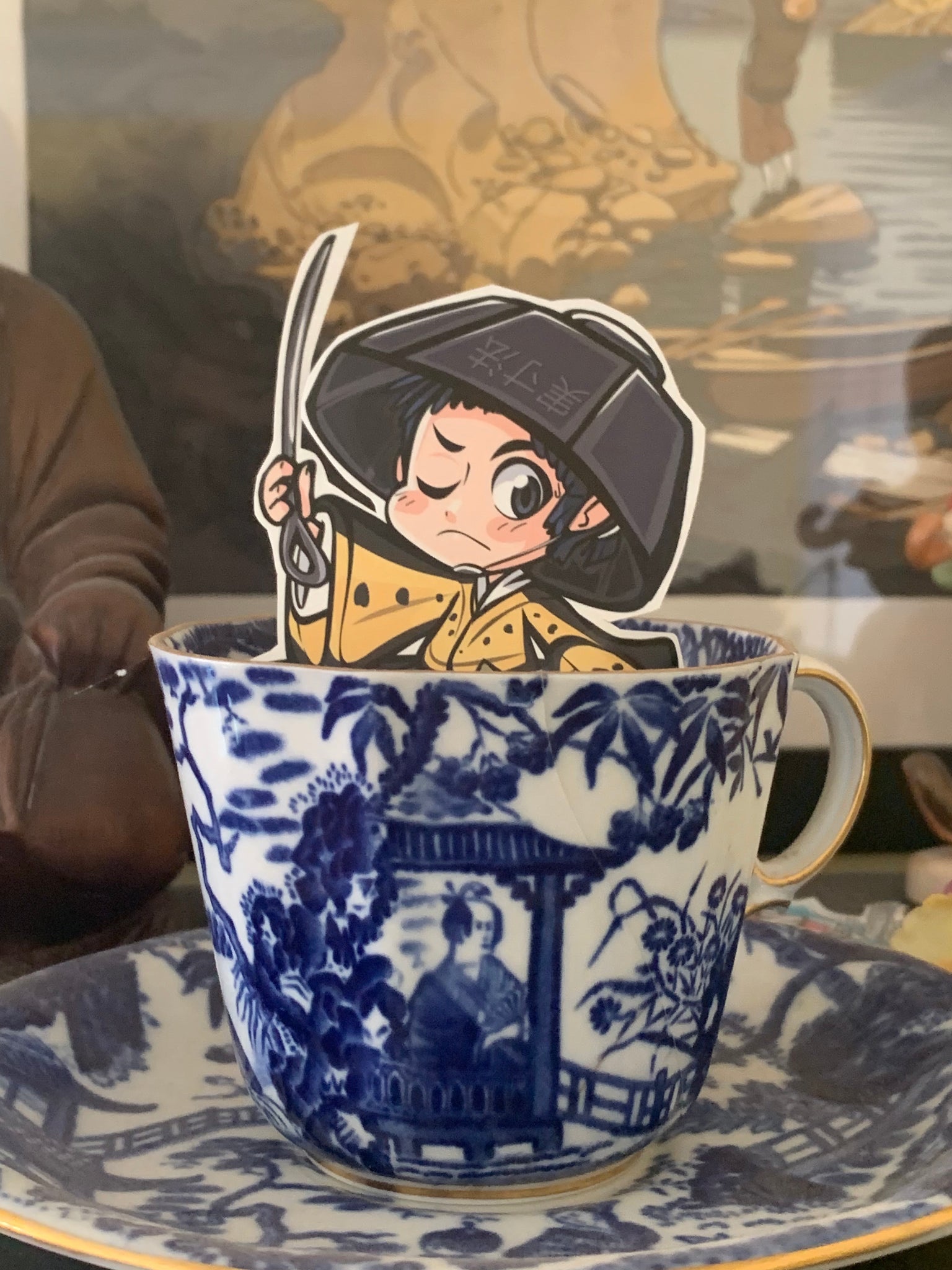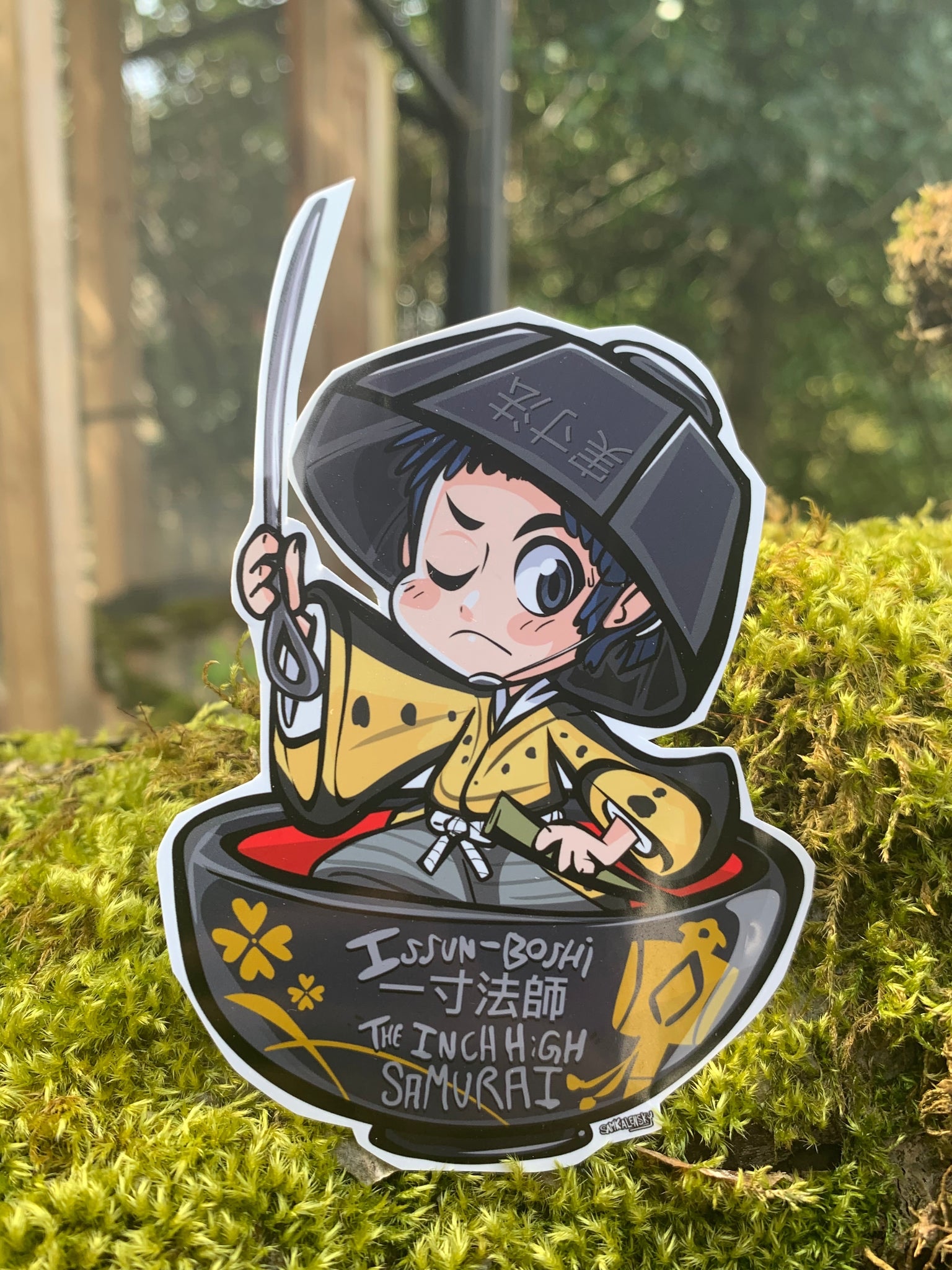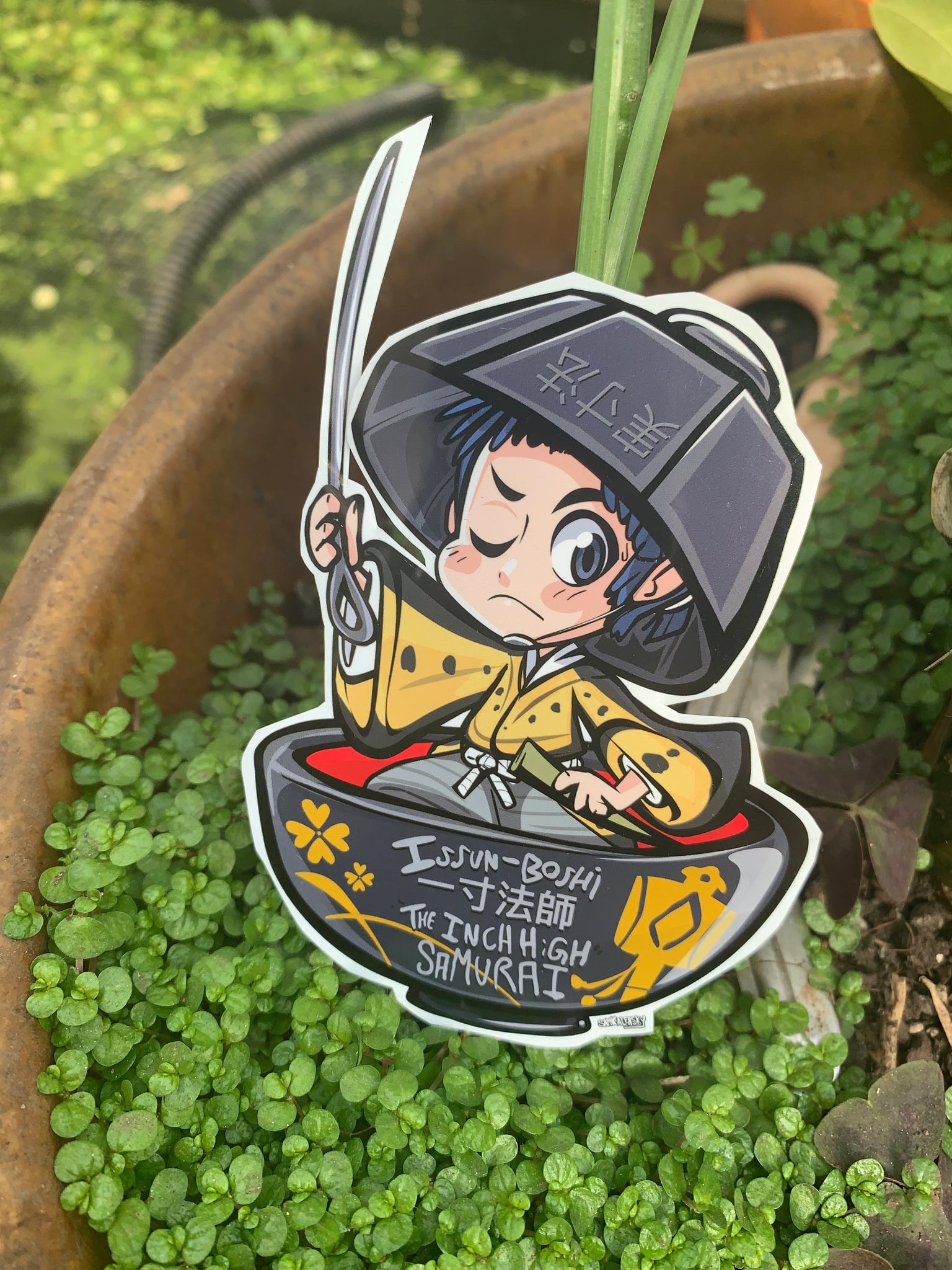 Issun-Boshi (一寸法師) or The Inch High Samurai was a clever young man who was born at just over an inch tall. – In some of the earliest versions of the tale:  the boy was scorned by his family because they “felt it was disturbing that he wouldn’t grow larger than an inch” and so they treated him a bit like a yokai, and so; Issun left to prove himself at a young age, travelling to the capital to become a warrior. Using a bowl as a boat, a small cup as a helmet, sewing needle as a sword, & a strand of straw as his scabbard. – He soon found work in the capital & fell for the chancellor’s daughter. – Who of course, wouldn’t marry him because he was so small. – So: in order to get her hand in marriage, he decides to frame her for stealing 2 grains of rice! [A very serious crime.] – As the chancellor and the daughter argue: Issun mediates (manipulates) between the two and soon l both isshun and the daughter are kicked out of the capital. – Later in the story, he earns her trust by saving her from an Oni (isshun gets eaten alive, multiple times, pokings his way out with his needle.) from that encounter, Issun gets a ‘magical mallet’ which he uses to grow to “normal size” & lives happily ever after with his bride…
