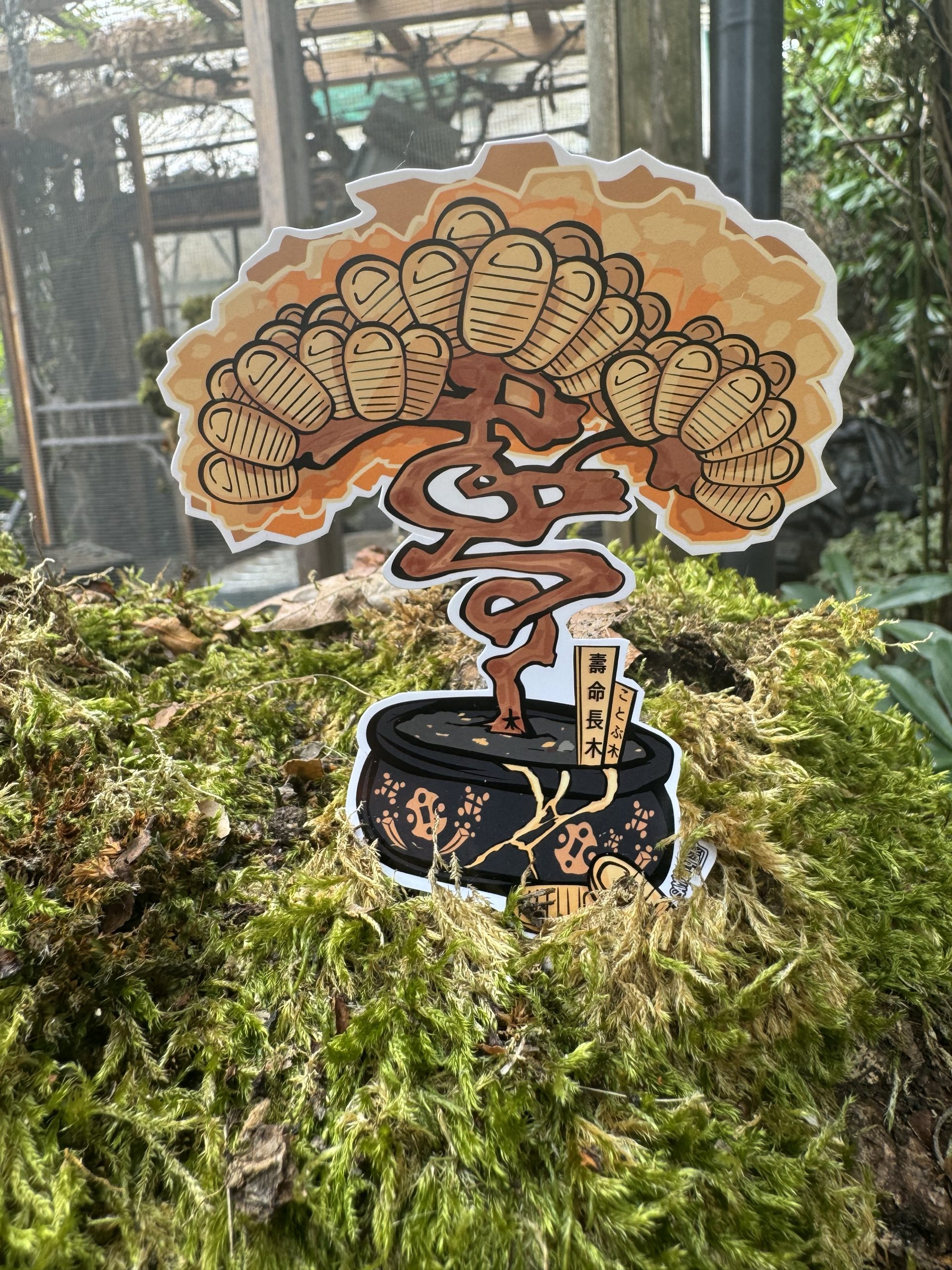 [fukurokuju opens a scroll, behind him are several bonsai that spell auspitious things image source] –Â In the above print (which inspired my sticker art.) The markers say âkotobukiâ and “long lifeâ with “tree “at the end – (More puns, its like saying “longevi-tree” and “kotobu-tree.”)â as for what the trunk of the money tree itself says? My Best guess is that its either a stylized cursive kanji of âåŊŋ” (âlongevity’, which fukurokuju represents.) or perhaps its an /extremely/ stylized âãããâ for âmoneyâ (its a bit hard to tell which it is for certain) – [shout out to the discord patrons for helping me figure that out.]
