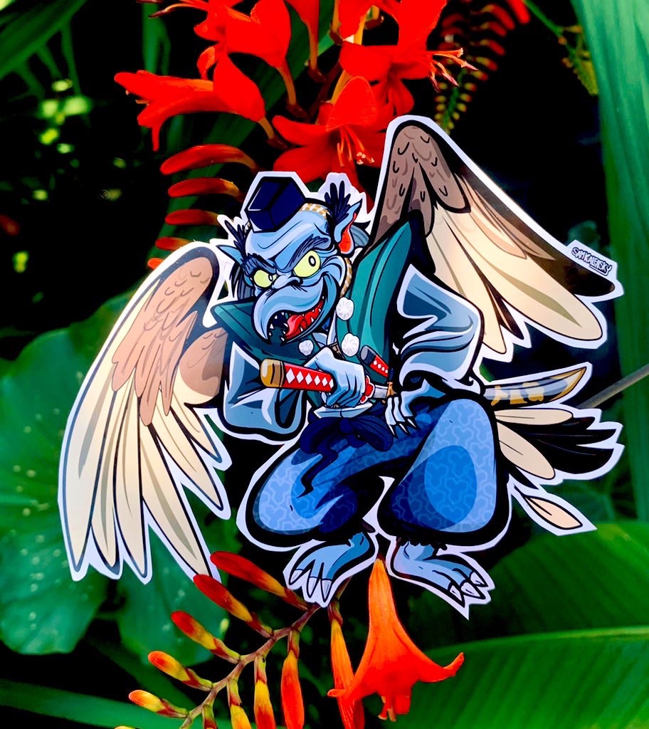 •About this Yokai: Despite being called a ‘crow’ in older pictures, Karasu tengu’s wings appear to be a bit more like a kite or a falcon rather than crow-like. They’re proud warriors, but they are very easily distracted. ✨ – This karasu tengu in particular is based off the blue kotengu statue of Tokyos Mt Takao.