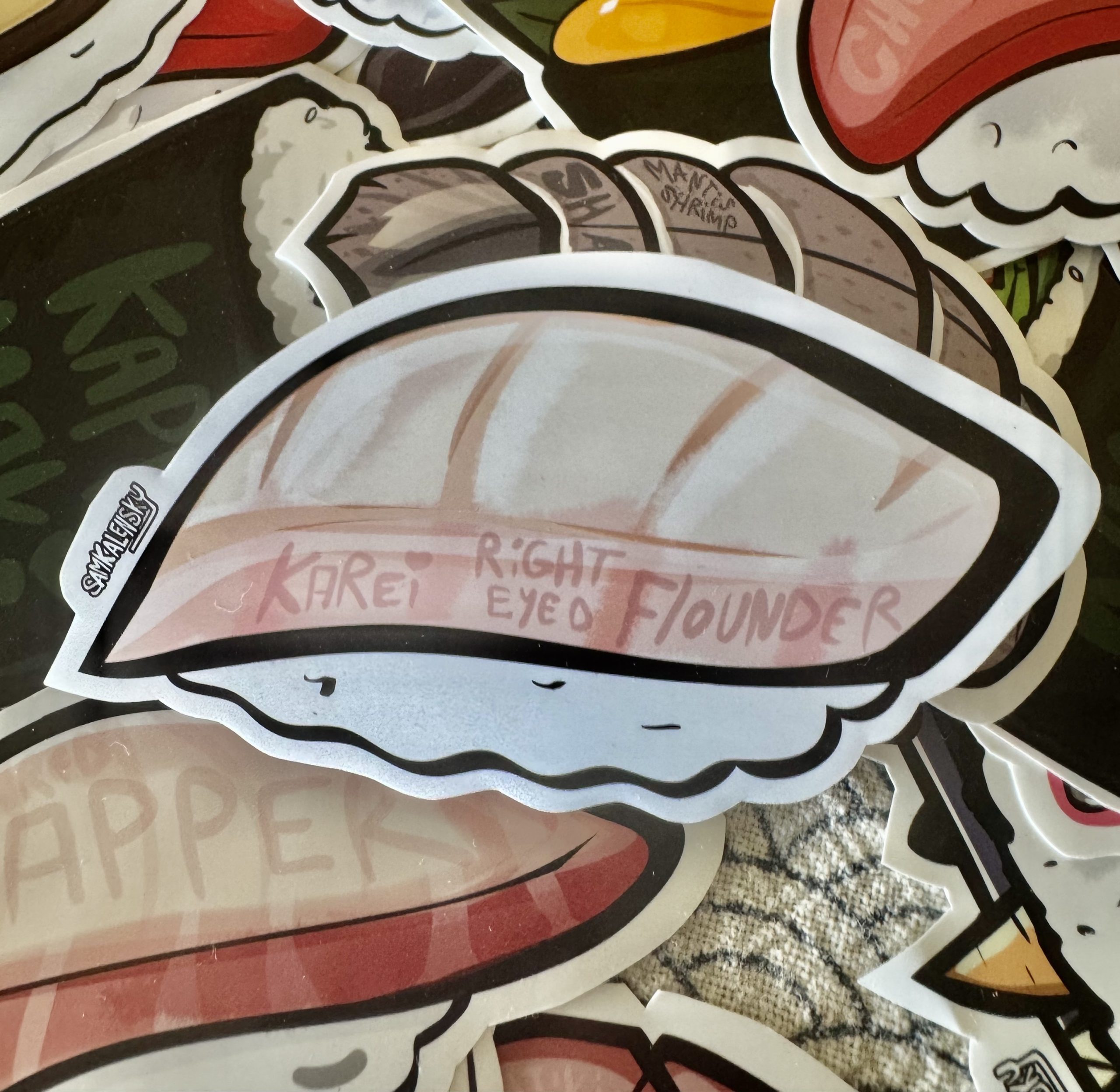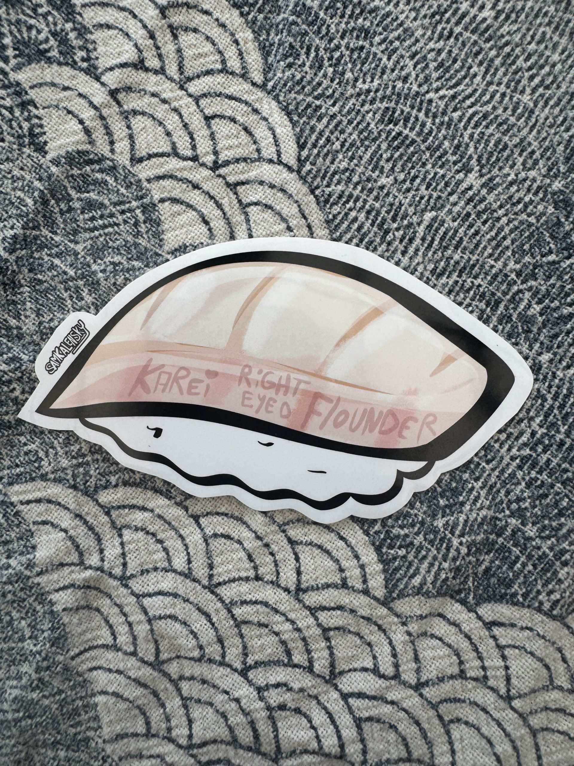 • About this fish: A small Right-facing flat-fish, its eyes typically shift as it ages, growing to the Right side of its face. Both Karei & Hirame have a particularly tasty tender, chewy, sweet meat found along its left and right dorsal fin muscles known as “Engawa.” – [Fun fact: These muscles are named after the long wooden porches on older Japanese homes!] It should probably also be noted that both types of flatfish are often conflated with ‘halibut’, ‘fluke’, ‘sole’, ‘dab’ and numerous other types of flatfish as well. This naming confusion is very common in English, because we collectively call /all/ of these ‘flatfish’ or ‘Flounders.’ – Japan seems to also have a similar bit of confusion, but perhaps a better grasp on the difference: A handy saying, used to remember the difference between the two types of flounders is: “左鮃 右鰈” [lit. “Left Hirame, Right Karei.”] – In folklore found across Asia, Flatfish with opposing eyes are considered soulmates; so they’re said to be symbols of inseparable, faithful lovers!