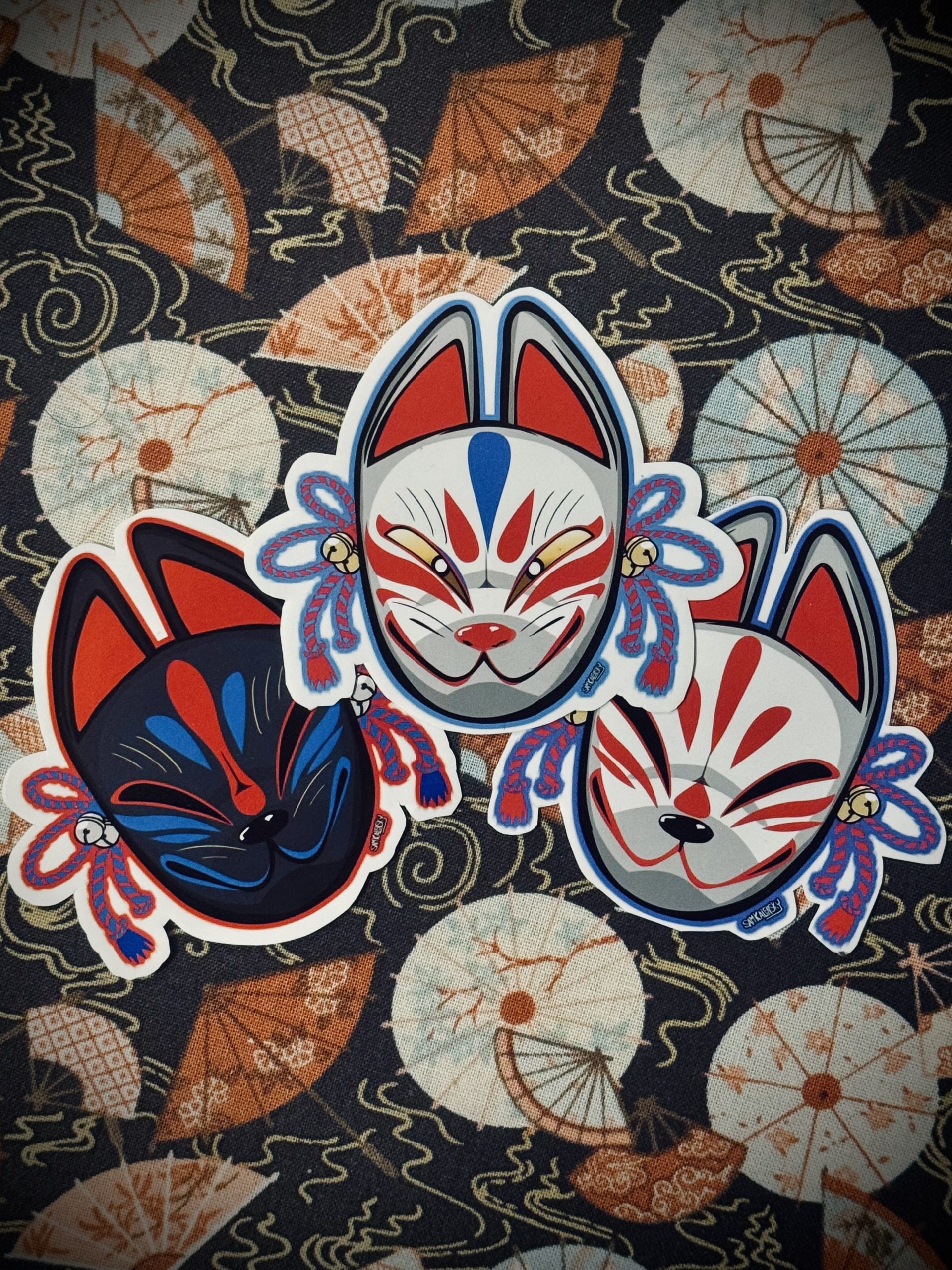 [Available here today are White kitsune, Black kitsune & Tenko (golden eyed) -my Kitsune Ryu design is coming soon, for other designs visit my noh collection]