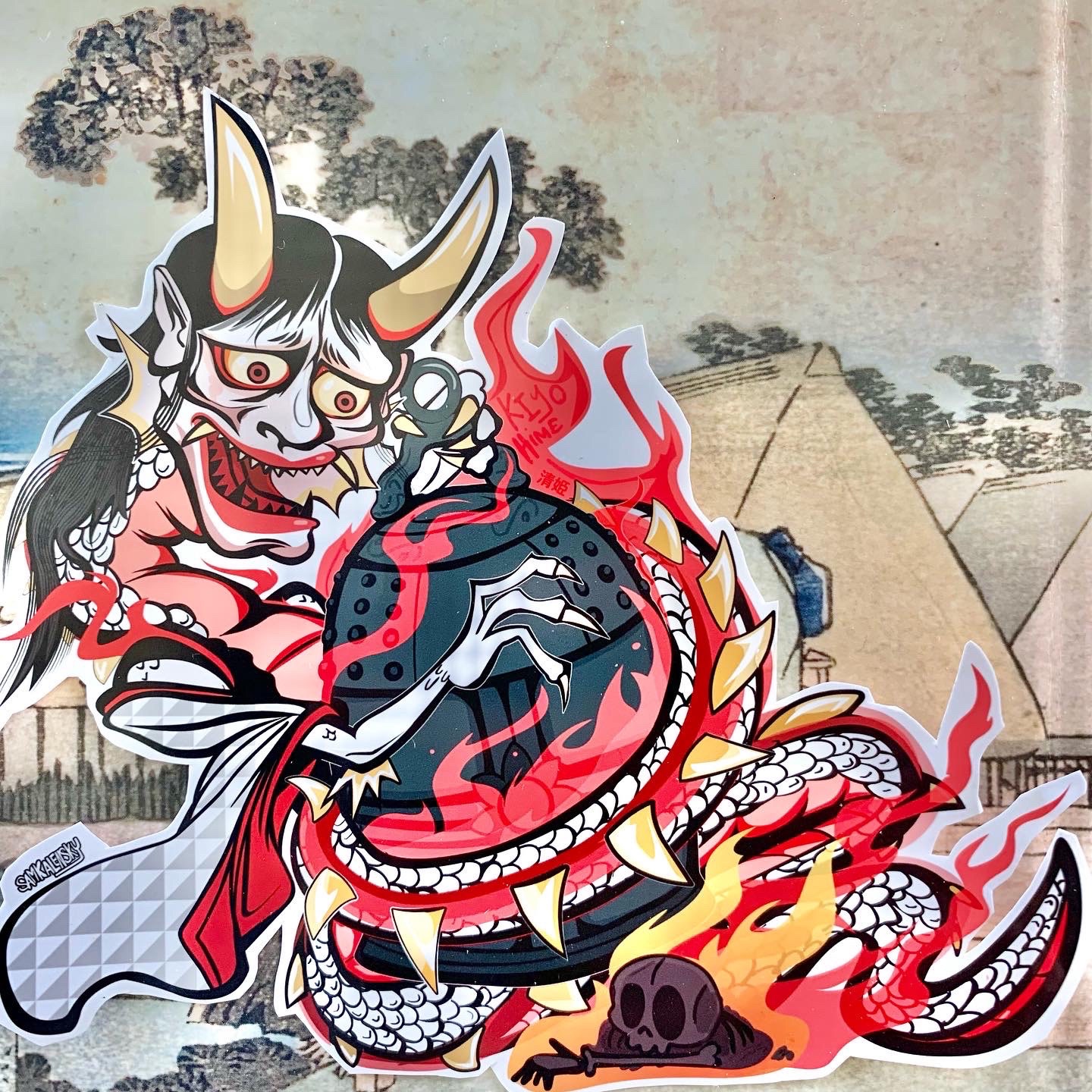 [Sticker Art by @Samkalensky (yo thats me!) – Part of my Night parade of 100 Demons – Yokai & Japanese folklore sticker collection, weather-resistant 4″ Glossy sticker. Check my shop & follow @samkalensky for many more!]