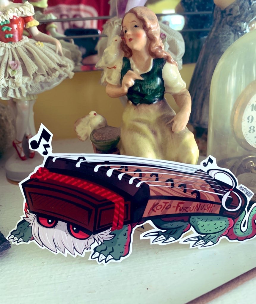 • About this yokai: The Koto is Japan’s national instrument, its a long, 13-stringed, floor harp. – Koto-furunushi: translating to”Old Master Koto” is a Tsukumogami based off of said instrument, it is also an anthropomorphization of the older, forgotten styles of playing the music. – Instruments are often said to become tsukumogami when they’ve been neglected by their owners, gone unpracticed and left sitting in storage for years, or even decades at a time! – They are often depicted (humorously) seeking revenge against the musicians who’ve neglected their practice or repair. – Koto Furunushi is often included along side Biwa-Boku-Boku & Shami-choro, The three are often said to be a trio that play forgotten songs and tunes together as a band. – These yokai serve as a reminder to practice diligently & to not let the old instruments & ways of playing be forgotten.