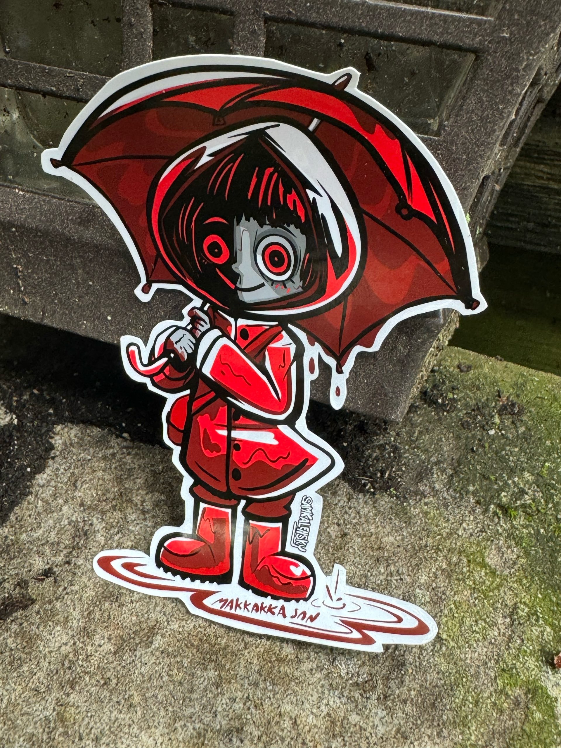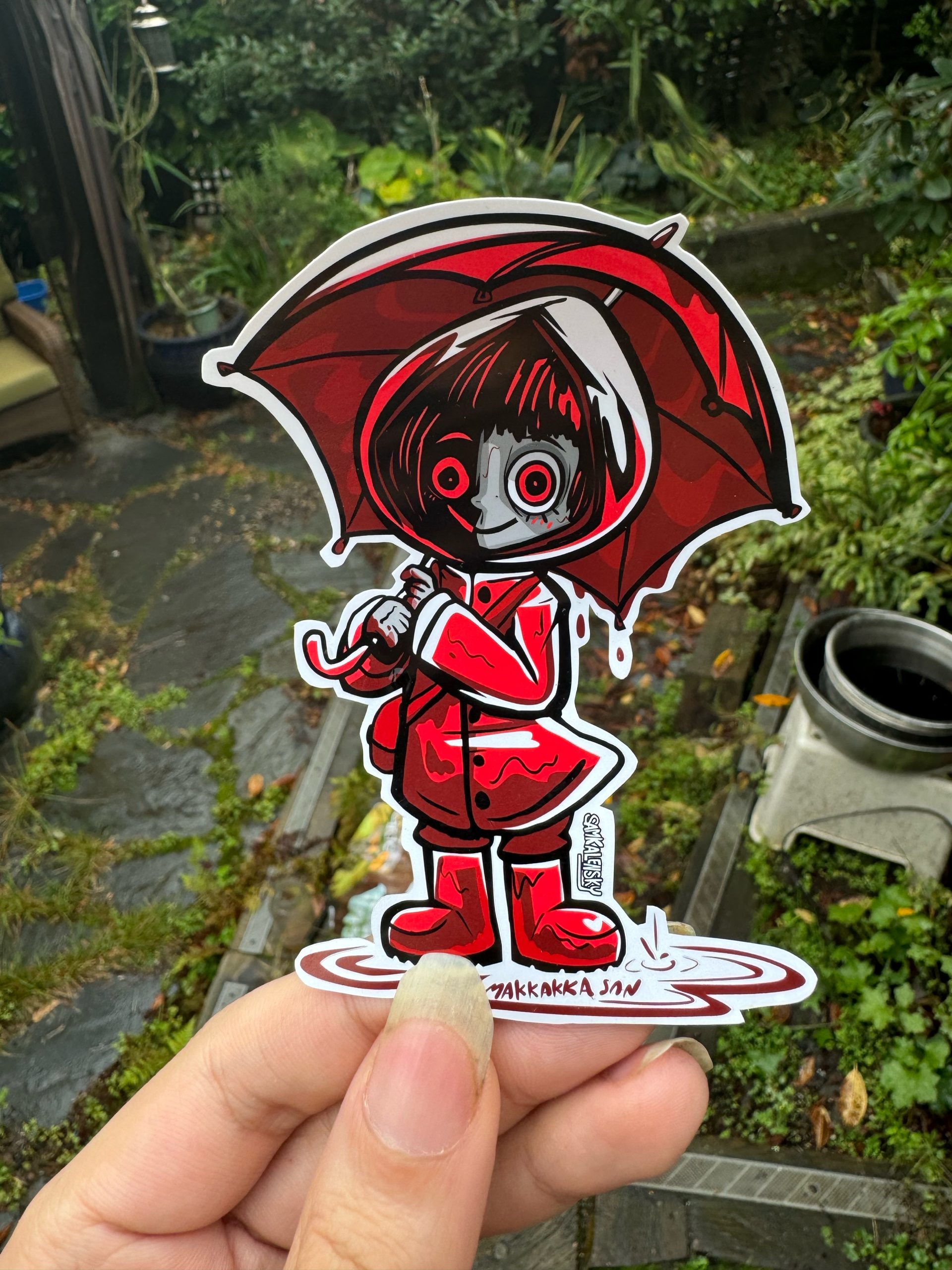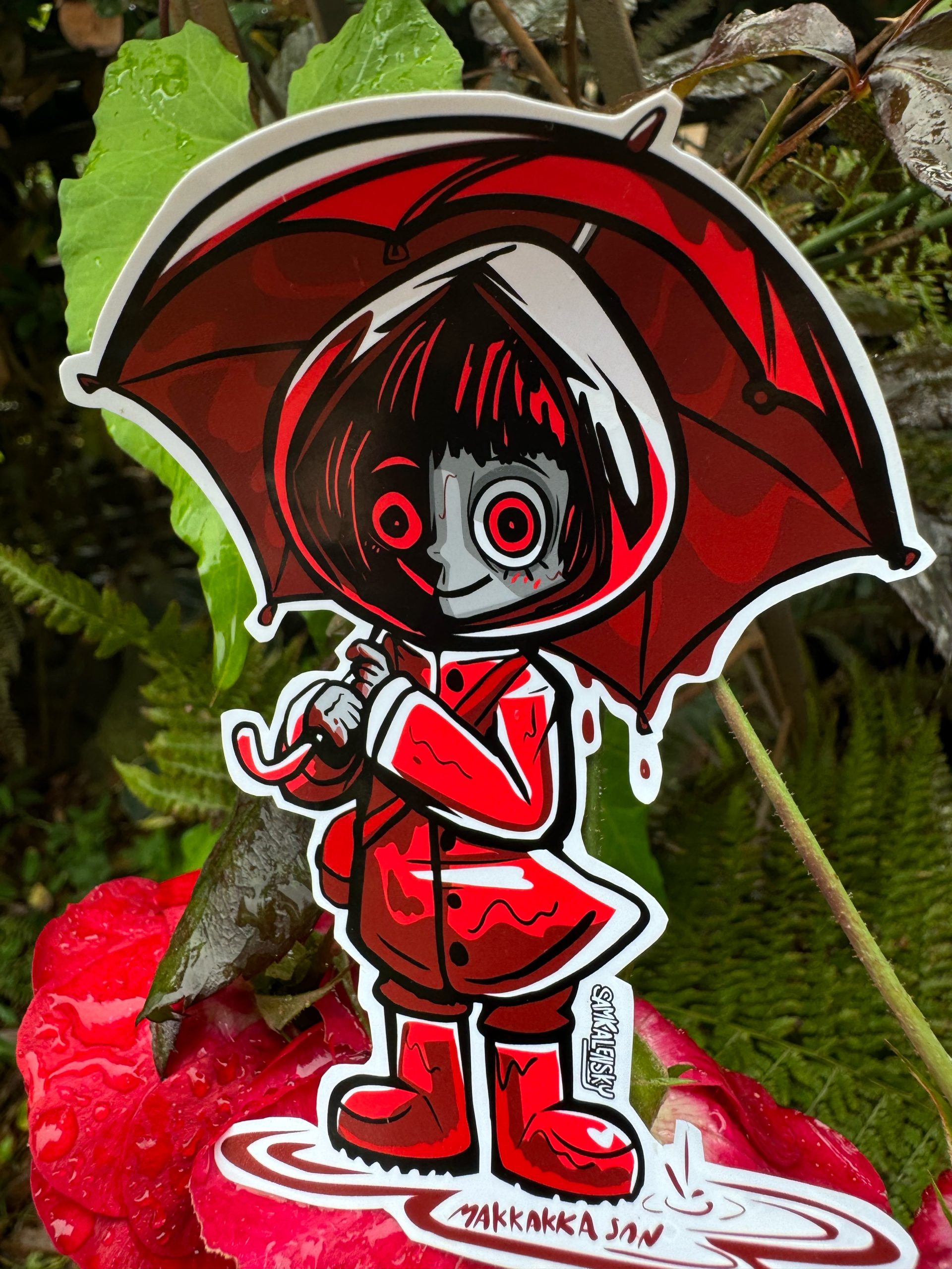 The next day, the little girl shared the story with her classmates and one of her friends instantly sat up and exclaimed, “You saw Makkaka-san!” She explained that he was a phantom child who appears only on rainy days. Anyone who sees him dies unless they’re wearing red. If it hadn’t been for her umbrella she would’ve died in some horrible accident. “