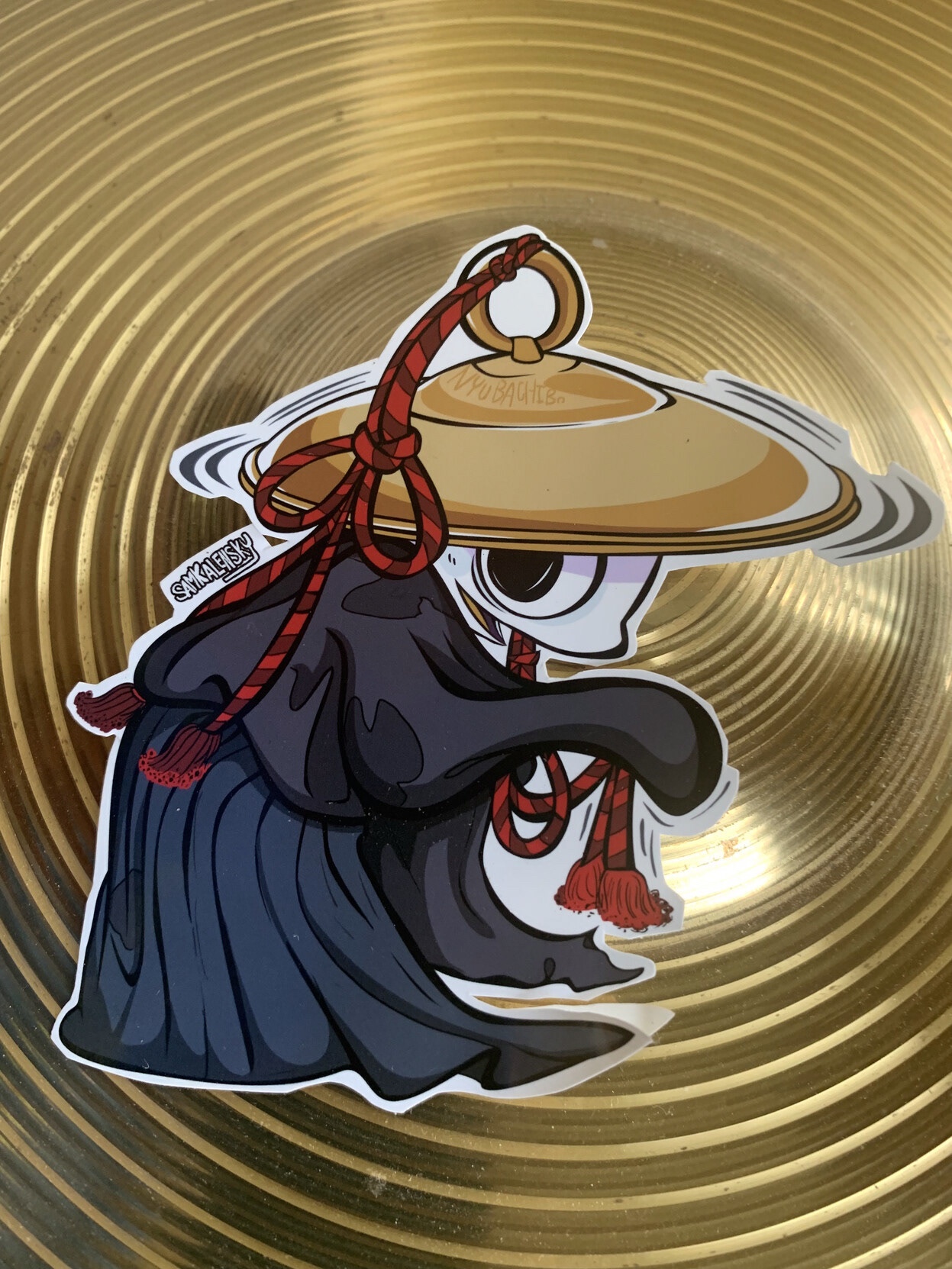 • About this Yokai: a Tsukumogami of an antiquated mini gong (called a “Nyōbachi”) played & commonly used in both prayer & during theatrical performances. (Nenbutsu dances, etc.) it surprises people and rings with a noise so sharp, that it might wake up the gods themselves…
