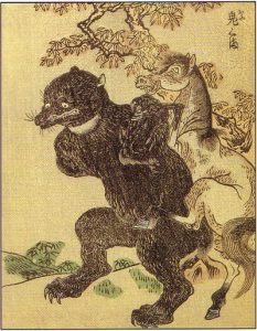 The one appearing in “Ehon Hyaku Monogatari.” 絵本百物語 (1841) appears to be a black bear. – [any resemblance to a certain mascot from Kumamoto is entirely coincidental. ❤]