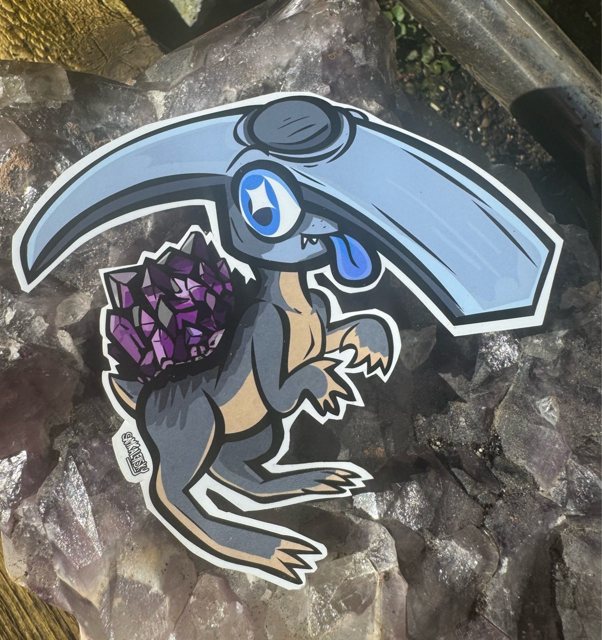 As the above article says, the creature’s physical appearance is indeed still up to debate, as the lore implies that “it’s never seen!” so its up to artistic interpretation as to how this one might look, As the description is very similar, I’ve chosen to draw it with a literal pick-axe-head to match my sticker for the Axe-handle hound. i’d like to imagine that licking all that salt causes a crystal-like geode to grow from its back (giving its body a porcupine-ish shiloette.) that their spikes might be to blame for the occasional odd Amythst or Agate found on Lake Superior shorelines…