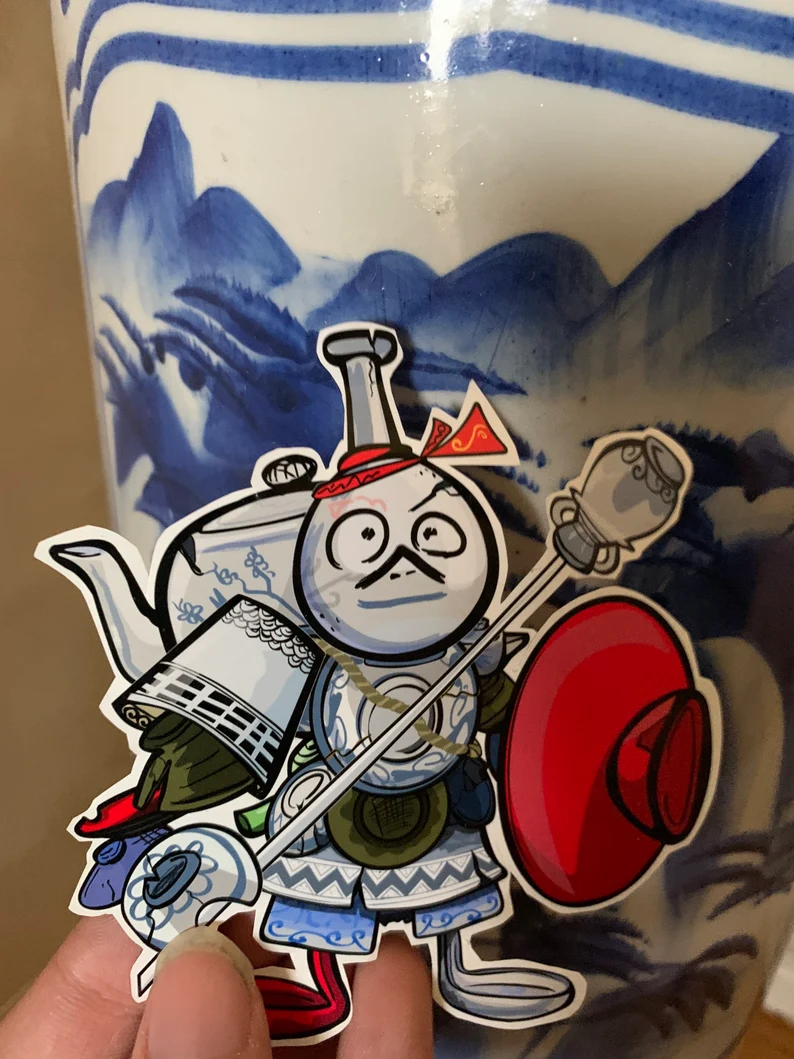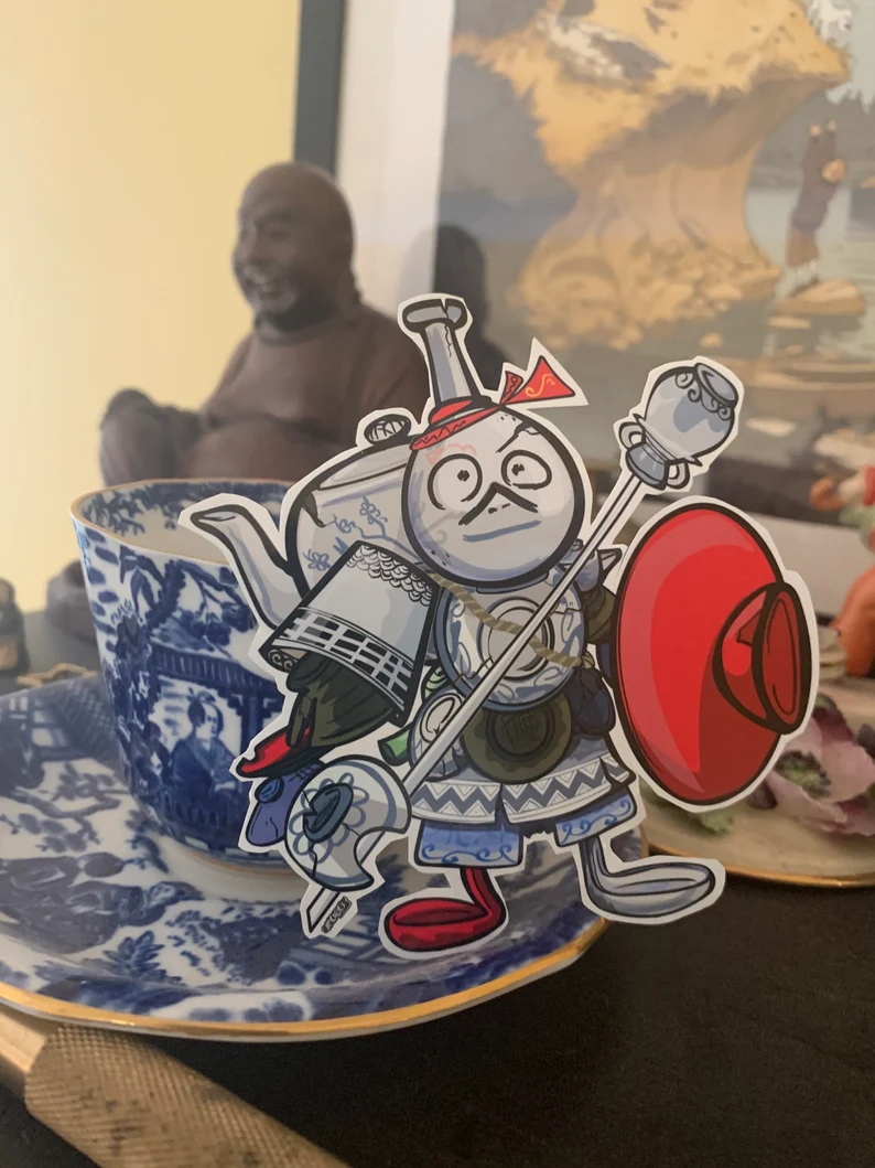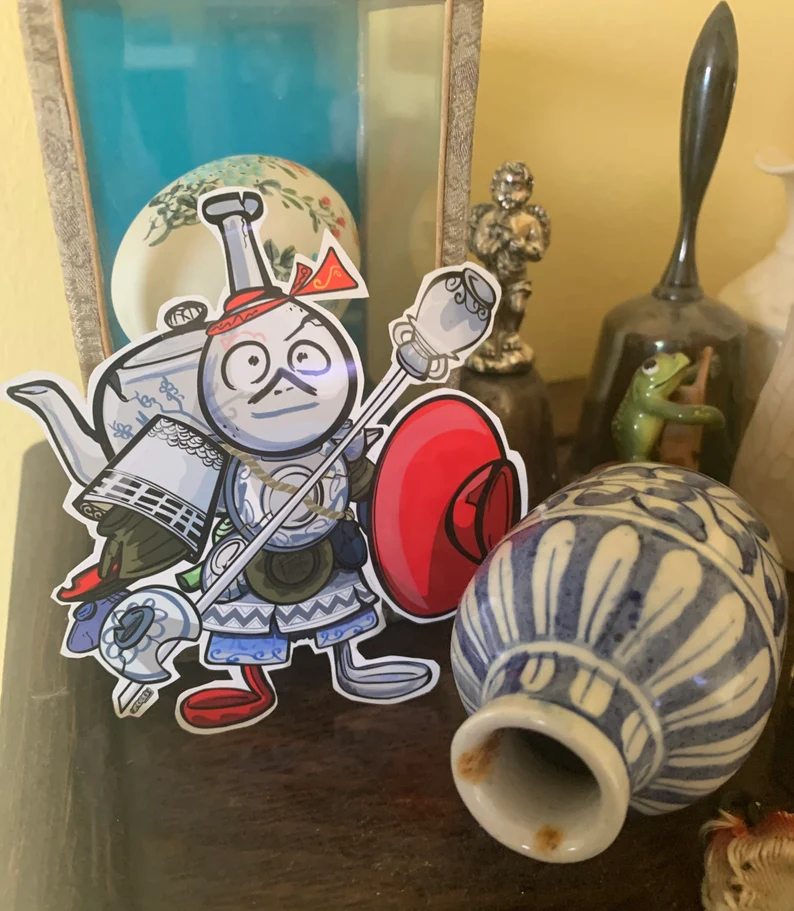 •About this Yokai: A small ceramic samurai, ready to take over your kitchen! – a Tsukumogami made up of old shattered Setoware ceramics; cracked pottery and broken kitchenware with a sake bottle for a face!! – If you don’t take care or do your dishes enough or if you accumulate too much broken dining ware and leave it around for too long, this guy might soon appear!! He loves to run around and wage wars against chefs, The entire kitchen becomes a battleground! If he breaks he’ll just piece himself back together!