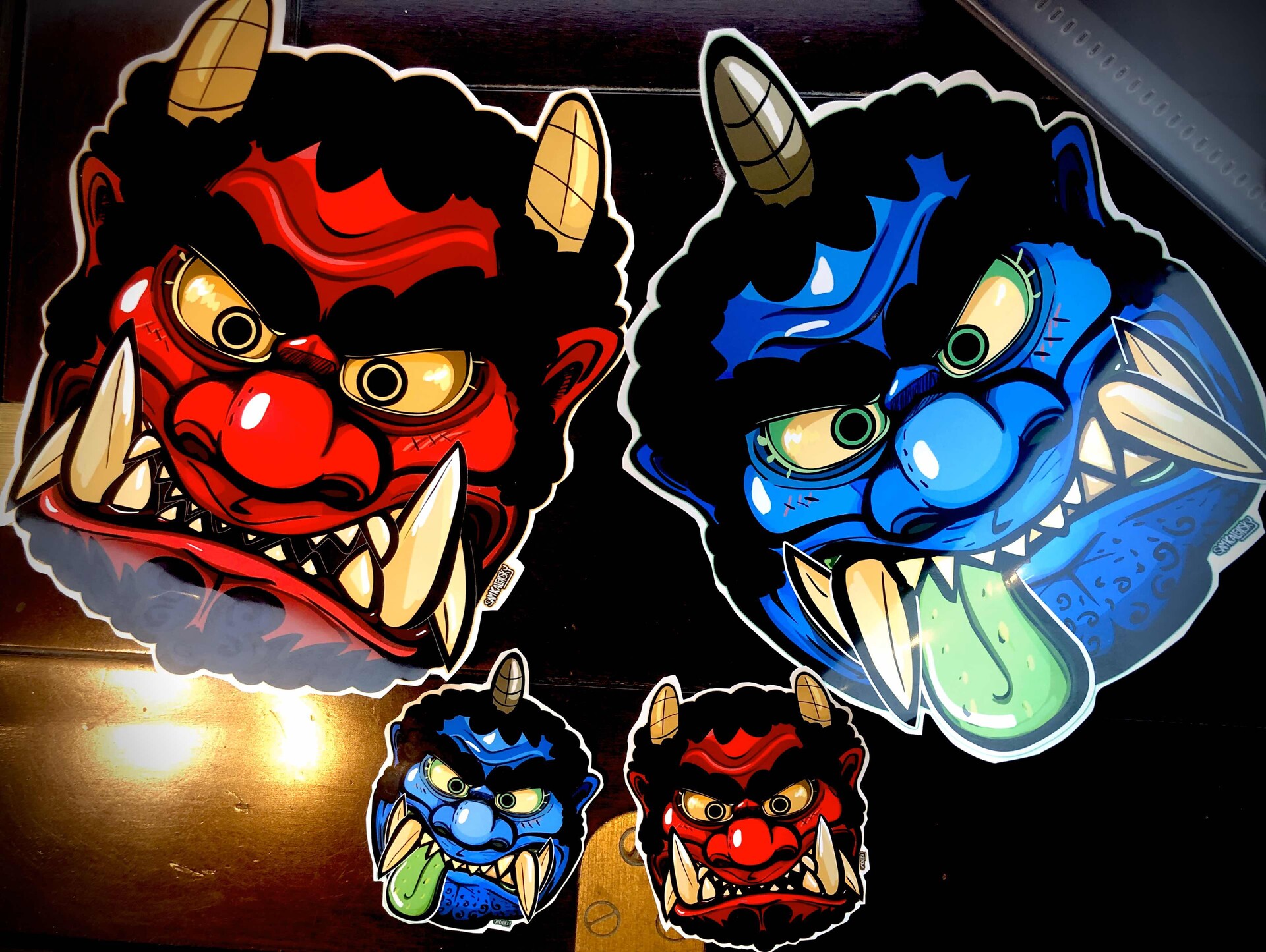 • About these masks: Oni are demons, Brutish Ogres of Jigoku (hell) where they serve under Lord Enma. Often seen wielding massive spiked metal clubs called “kanabo” and wearing a tigers pelt. (Showing off how tough/intimidating they are!) they have 3 fingers on each hand said to represent buddhist vices. – Oni are also said to have the teeth of a tiger & the horns of an ox!