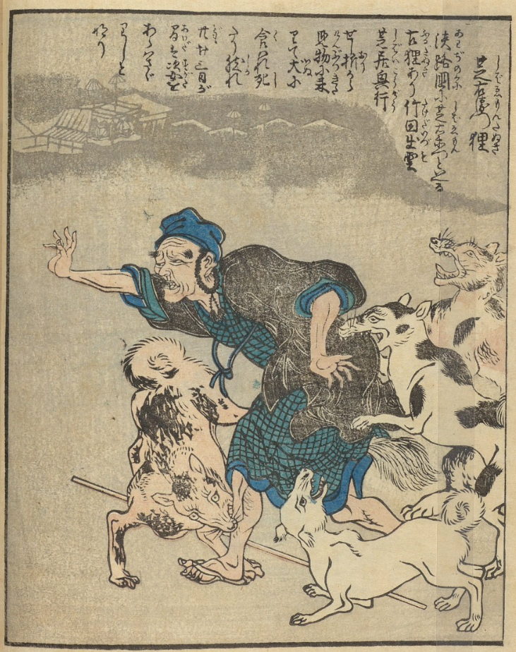 [image source: Smithsonian. Ehon Hyakku Monogatari volume 3. - ‘Shibeamon’ disguised as an old man, being mauled by guard dogs, (the bushy tail gives him awayl)]