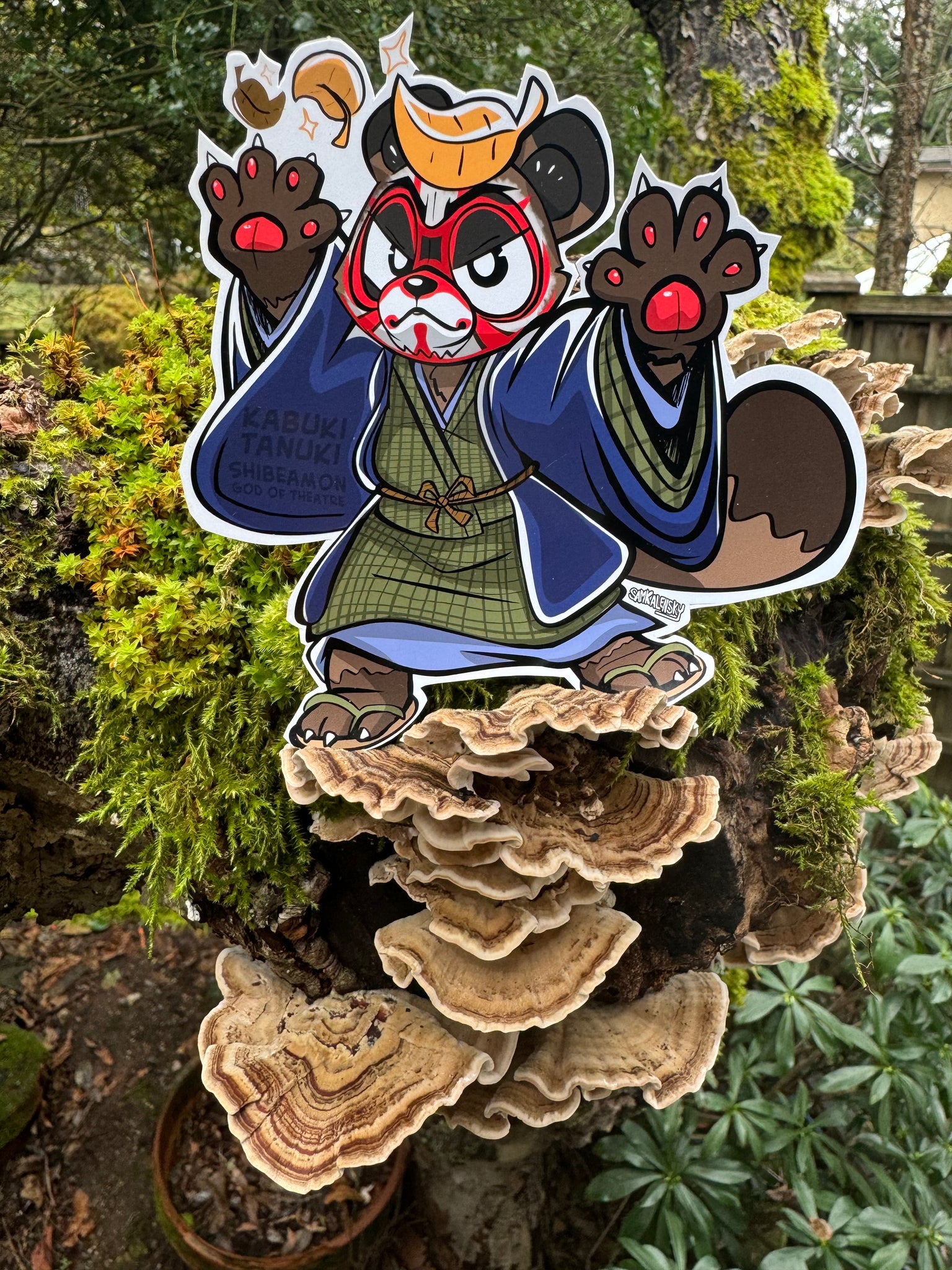 • About this yokai: This Tanuki was very much into theatre, especially Kabuki & Bunraku dramas. [As the areas posthumous ‘Patron God of Theatre’ he was the definitive "Kabuki Tanuki!"] A resident to Mt. Mikuma, near the city of Sumoto, Awaji prefecture. Everyday, he would transform into an old man and go to the Nakaza theatre in Dotonbori Osaka. He would attend all sorts of plays and other lavish events along with his wife. (It’s often said that their favorites were by the playwright; Takada Izumo of Kanadehon Chûshingura (‘47 Ronin’) fame.)