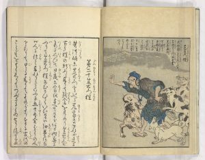 [image source: Smithsonian. Ehon Hyakku Monogatari volume 3. – ‘Shibeamon’ disguised as an old man, being mauled by guard dogs, (the bushy tail gives him awayl)]