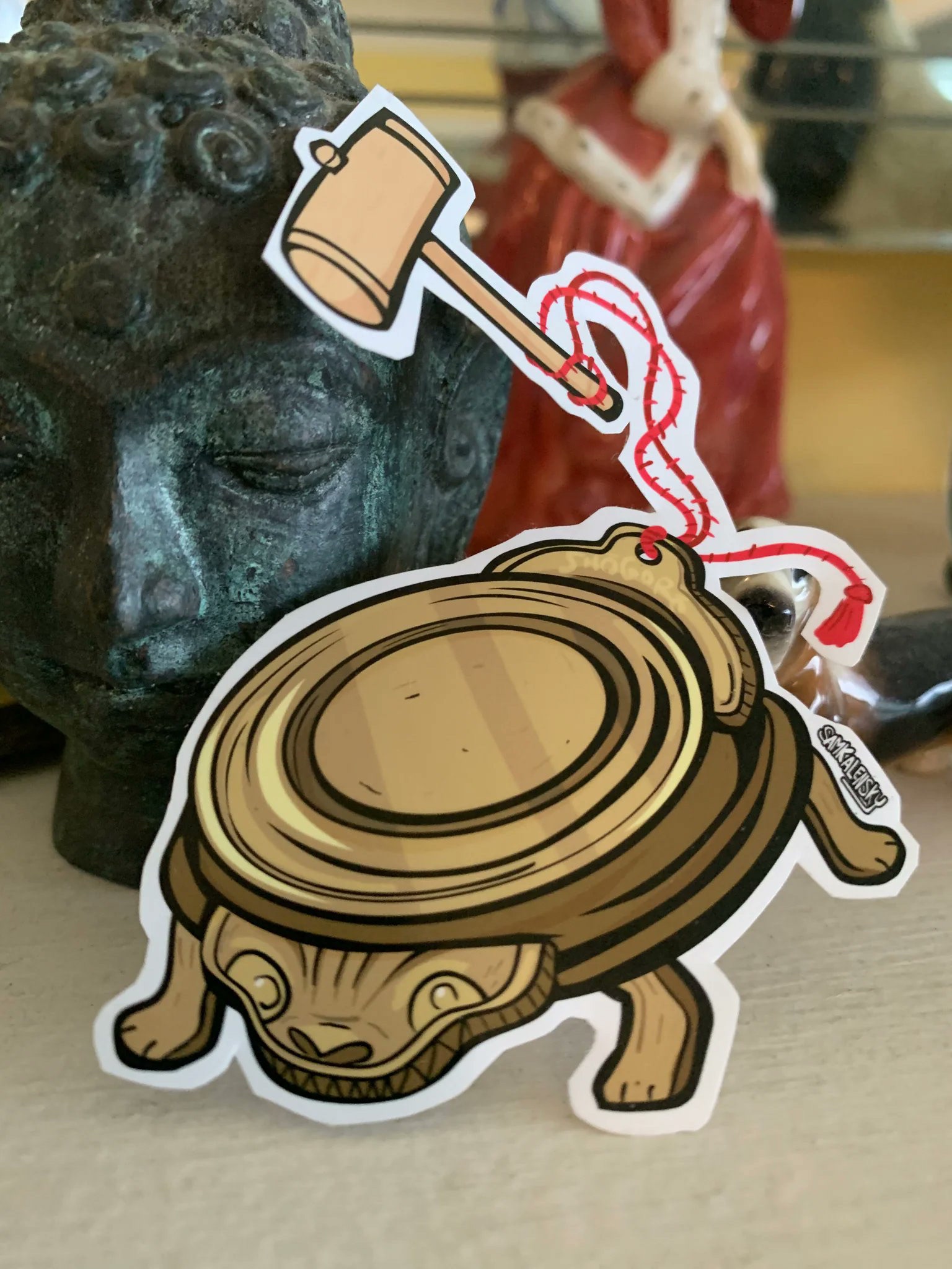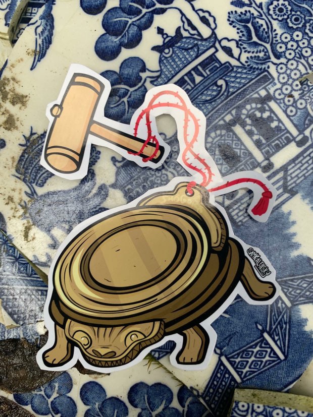 • About this Yokai: a turtle-like Tsukumogami of an antique mini-gong called a shōgo (鉦吾) frequently used in buddhist services. At some point, the antiquated item combine with the soul of an wealthy aristocrat: The Shōgorō rings out every night in greif, as a reminder to be humble in your wealth & not to act conceited…
