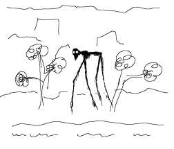 >”We turn around and I barely have time to register what I’m seeing because it was dark. There was something black about half as tall as the cliff, so 15 feet tall-ish, on these extremely spindly legs noiselessly sprinting through the trees on the opposite bank. I couldn’t make out the shape too well but my impression was that it was covered in long hair and its body and head were kind of like a dog looking down, but stretched longer. Most of its height was in its legs, which were really thin. Jarrett turned on the flashlight and shone it across the water at the thing and it stopped moving and turned to look at us. It had humongous eyes that reflected the light from the flashlight. After a split second of this it turned away from us and just scaled the cliff as easily as it was striding across the ground and disappeared from sight.