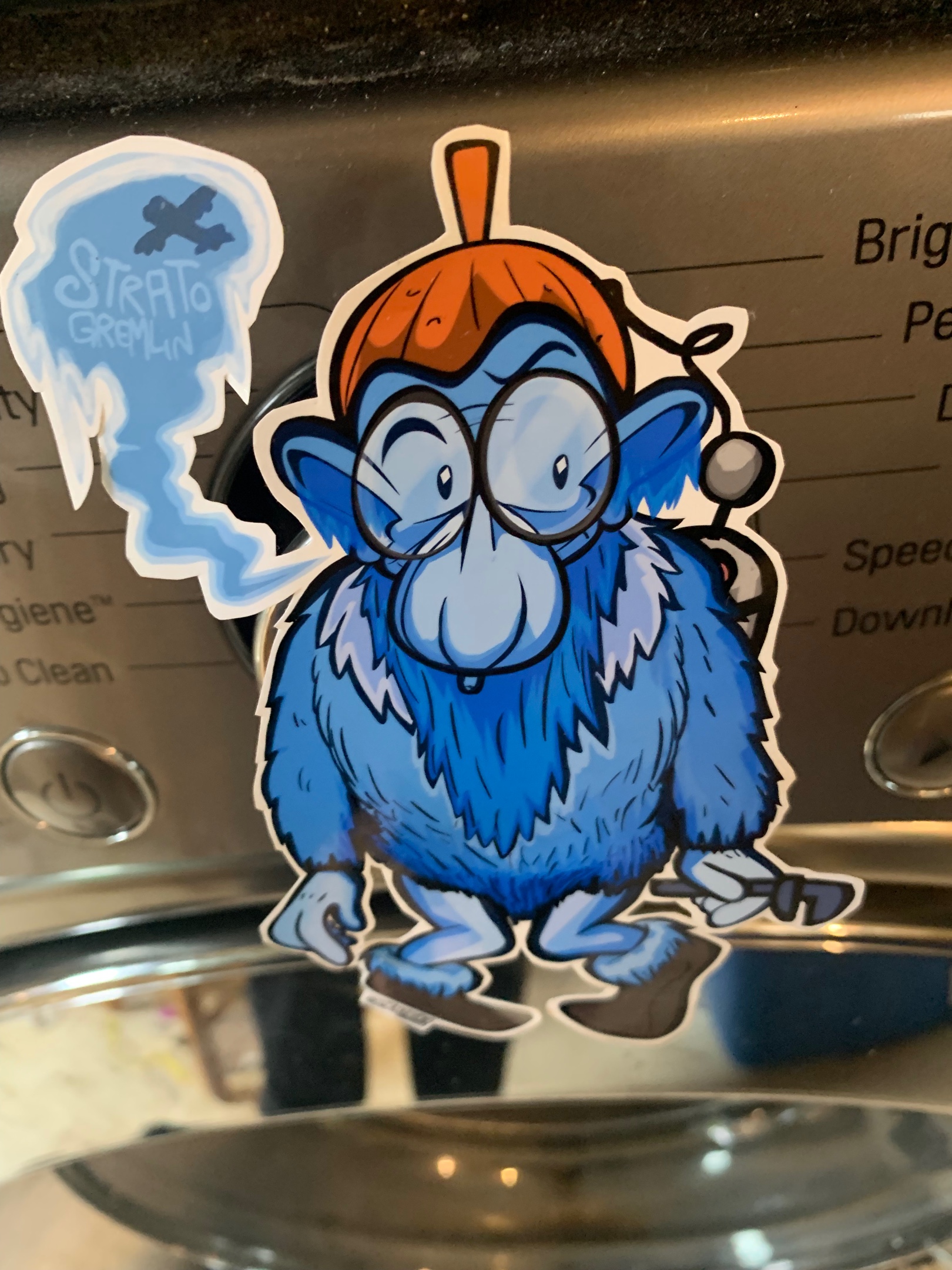 Aside from his inner and outer coats of blue fur, the strato gremlins distinquishing mark is his large nose that looks very much like the oxygen mask breathers bag.