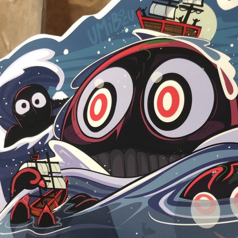 • About this yokai: Umibozu are mysterious ocean giants that vary in size from the hight of a human, to the size of a boat, or much, much larger. They are often said to resemble a balding monk. (The religious tie-ins end there.) Usually appearing on calm nights, right before a storm, they’ll rise up from the depths.
