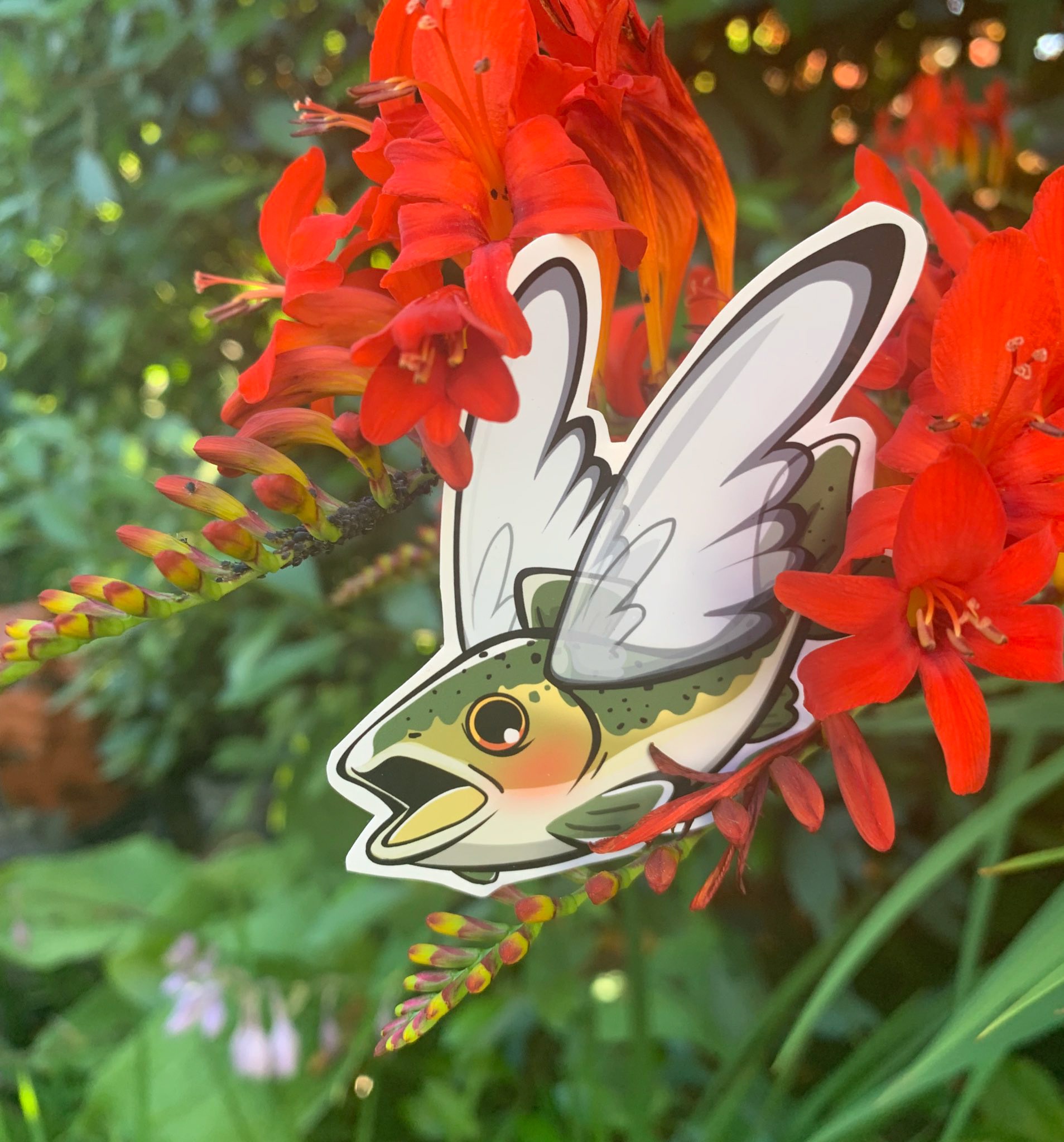 Although these days the “Upland trout” is often pictured with literal wings, the 1935 description does not mention wings at all! – early book & magazine illustrations of the ‘upland trout’ feature it humorously managing to fly (or swim) in the sky just fine without them! (The wings are usually an added take to show that it’s literally flying, plus wings make it more appealing from a design perspective.)Â