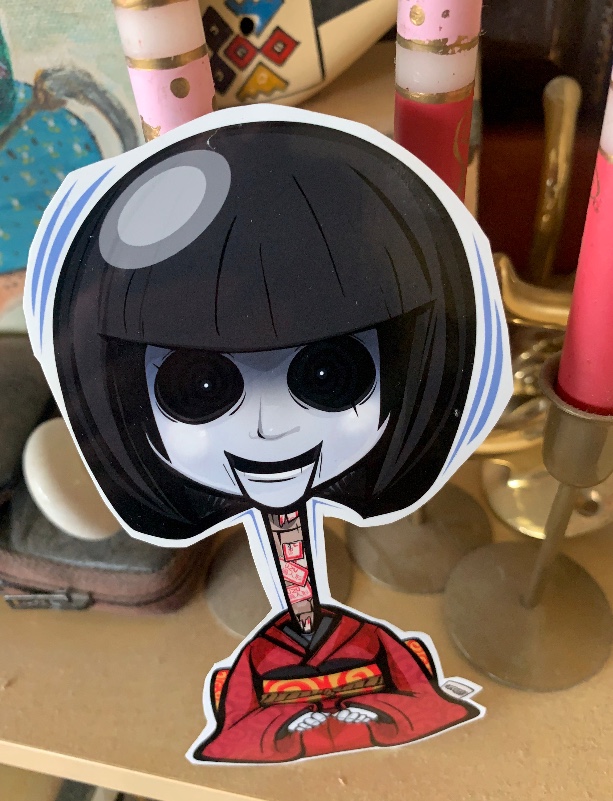 • About this Doll: An eerie child-sized doll with a bobbed haircut, white face, hollow, pitch-back eyes, a smile shaped like a crescent moon. it has an abnormally thin, extendable neck which can reach up to a meter. it wears a faded old kimono & sits with its hands on its knees, legs tucked neatly underneath. The doll was made in Kanpo II, 1743. -it lets out a toneless, robotic laugh; “Hyo. hyo. hyo.” – Causing insanity in those that hear it, they are unable to stop laughing, crying & speaking gibberish. …Even if you burn it… it will eventually return.