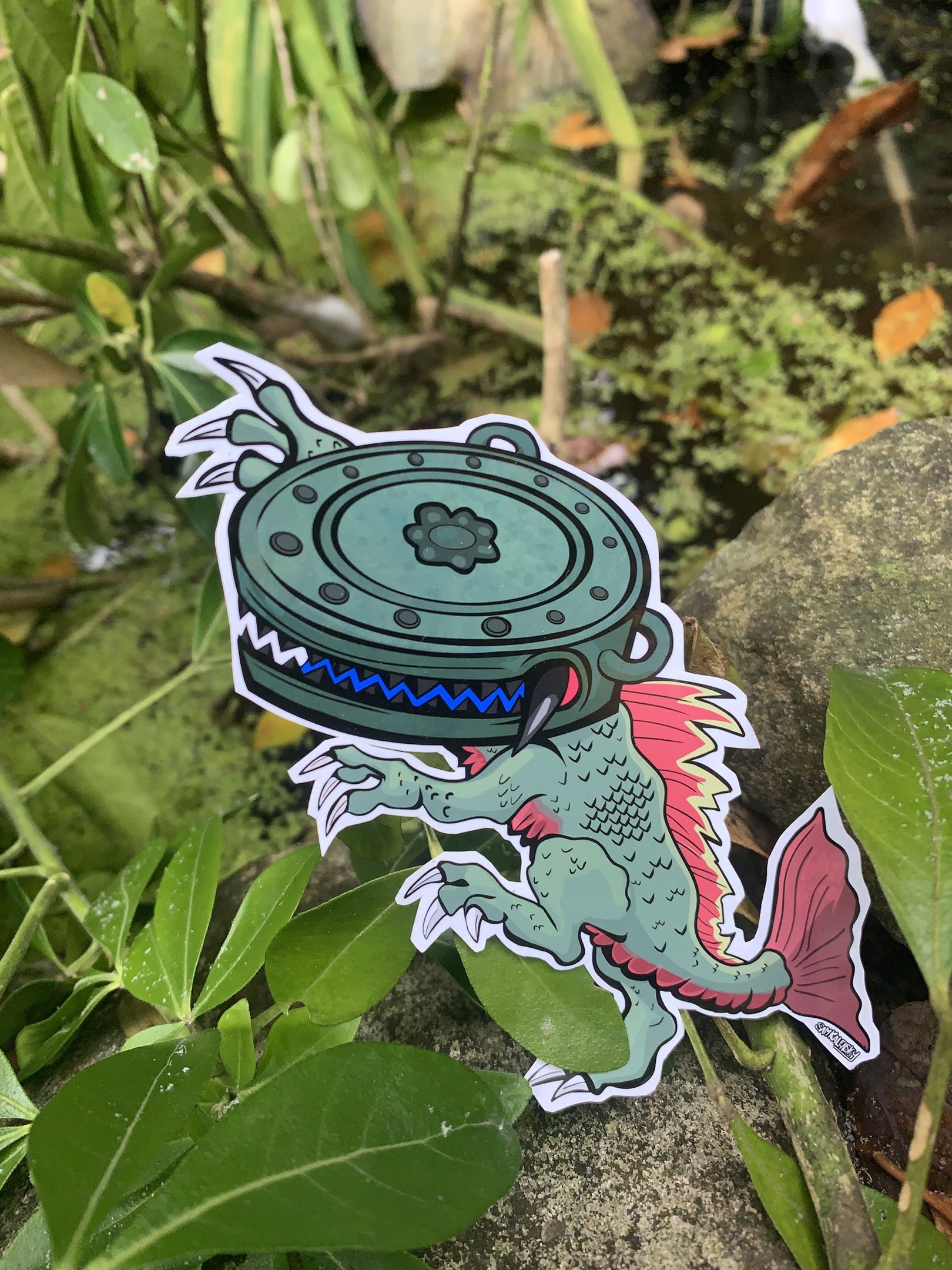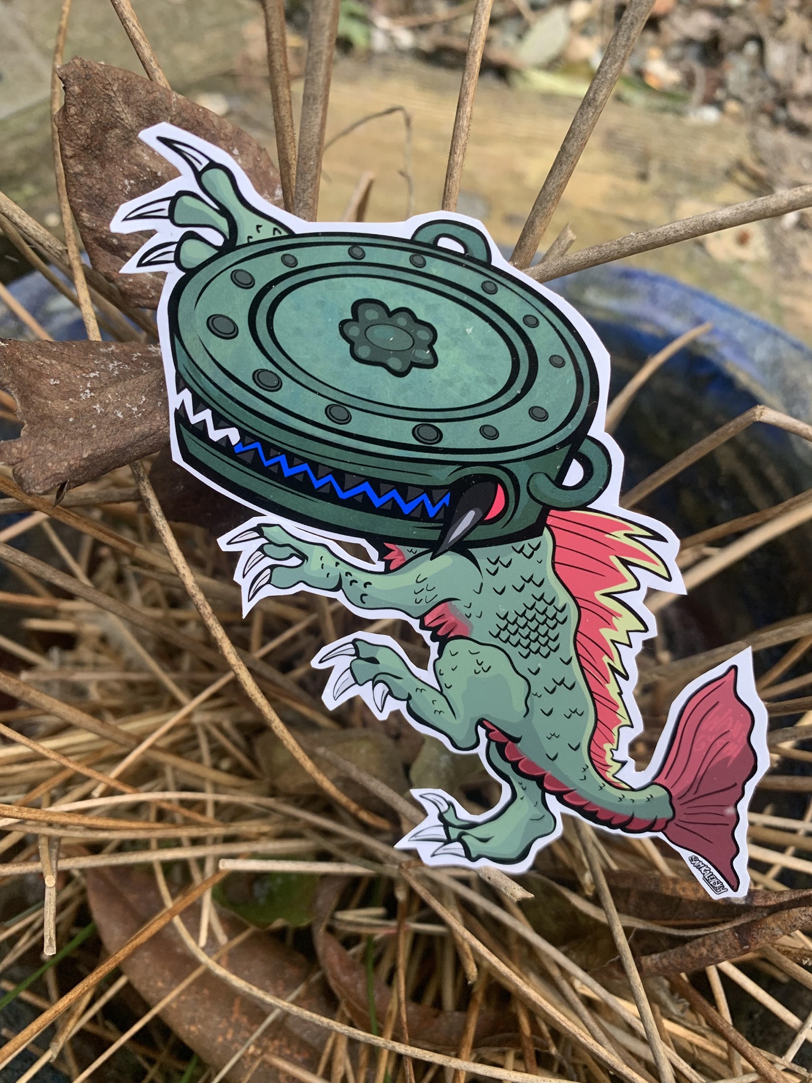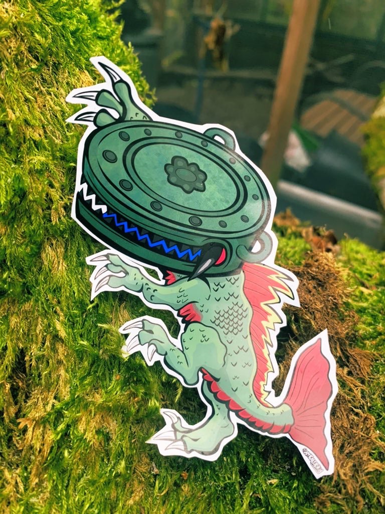 • About this yokai: A Tsukumogami of a flat, copper shrine bell, the kind often seen at Shinto & Buddhist shrines, named for the items resemblance to a crocodile, alligators or a dragons mouth. The bell has rusted and turned green, sprouting fangs and the wriggling draconic body like a ‘gator. – Tsukumogami are often said to appear if an area is left disrepair or neglected, seeing as shrines are holy places, prayer instruments aren’t very often left in neglect. so it must have been abandoned.