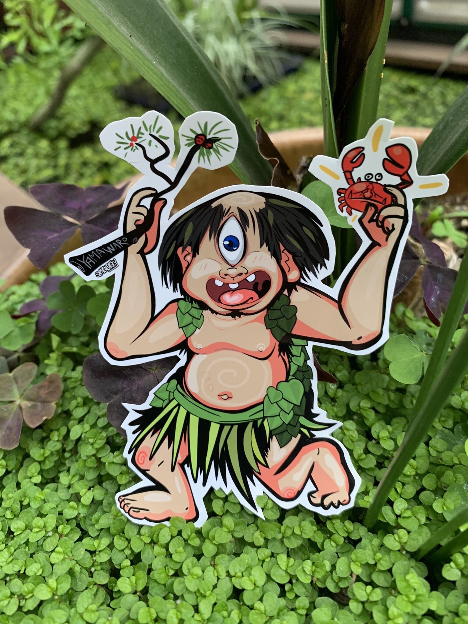 •About this Yokai: Yamawaro are childish cycloptic yokai which go by many names, This somewhat scruffy looking mountain cyclops is theorized to be “a seasonal form” of Kappa & Garappa which have migrated to the mountains during the autumn equinox. It’s said that when Kappa travel to the mountains in the fall they change into a “Yamawaro” then when spring returns, they migrate back to the rivers and become kappa again. (this migration pattern is different across japan, but most kappa-like yokai are said to tend to do it too!) They become angry when people build in the way of their migration paths and are often blamed for mysterious property damage.