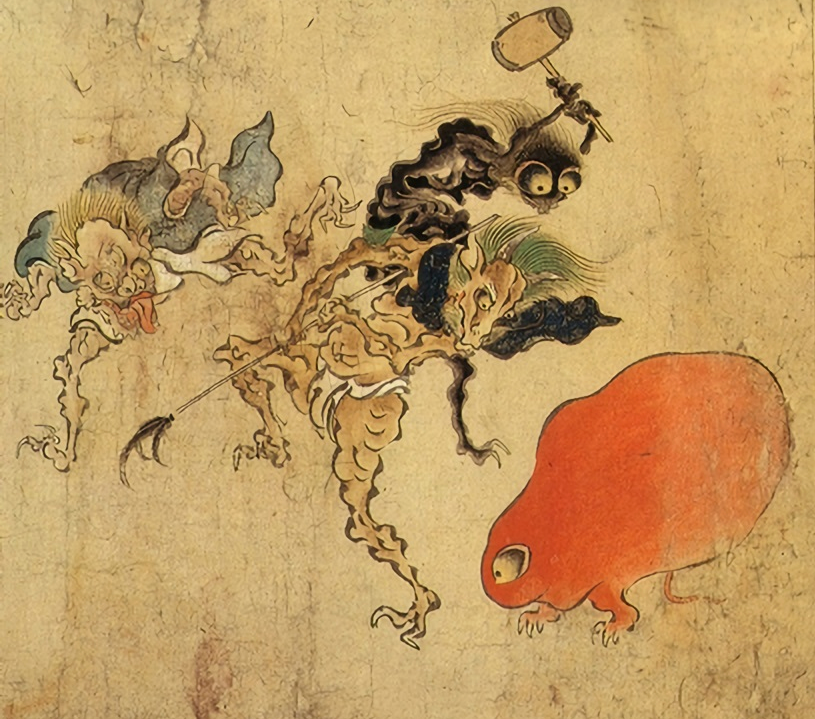 • Similar yokai: Something we do know is that the poses of Yarike and company are likely taken from a Muromachi-era Hyakki Yagyo Emaki picture scroll. [below] The yokai which the others (Zenfusho and Koinryo) are imitating aren’t named, but the one Yarike is copying is Kanazuchibo, posed with his mallet to smack down Okka as usual.