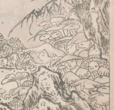 In the bottom right corner of the centerfold is a patch of mushrooms with the faces of bearded men. There’s no description for these yokai mushrooms so one would assume they’re just a whimsical touch added on a whim. But the fact that Sekien has added plants with some symbolic meaning in his other yokai pictures is enough to make me wonder if there was any meaning to the mushroom men; possibly lost to time? -These man faced mushrooms bring to mind my favourite mushroom obake and particularly of the Kyogen skit "Kusabira." – [a short play about a Yamabushi monk; who is trying to exterminate mushrooms from his neighbours garden, but he somehow makes things worse, which causes the yokai mushrooms to multiply!! In the end; he accidentally summons a gigantic evil mushroom that chases everyone off of stage! [You can Watch a performance of it here. ] i digress its unclear if they have any significance what-so-ever!